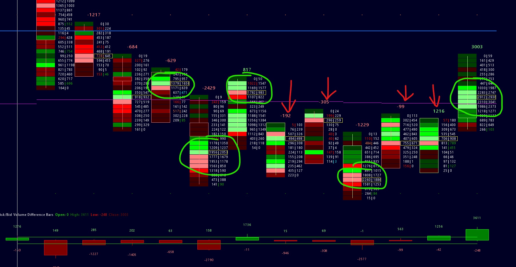 Right now all the settings I tired seem to highlight largest volume for each bar the same color, no matter if volume was 600 or 5000. If I want the bars to show big volume like the ones circled by green to have distinctly different color from small/ regular volume. So that big volume clusters stand out from other bars like the ones with red arrows. Do I need to set "Actual Volume compare thresholds" instead of percent? As it seems percent settings only compares volume for each bar individually, not all the other bars.