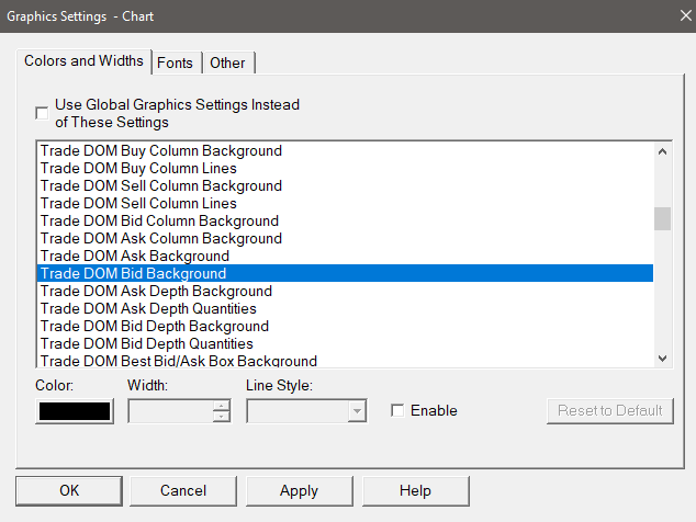 I updated the software and lost the background color on my DOM. I’ve gone through the the graphics setting and changed one at a time on the background color and nothing changed. Am I missing something. I’m also missing my P/L on top of my DOM and have checked to display it. I am also noticing every upgrade so far is altering color or something else in charts, DOM or the Fill Marker Size. Please advise how to get my DOM background back to color black, P/L displayed on my DOM. I’ve attached pics on my settings. |