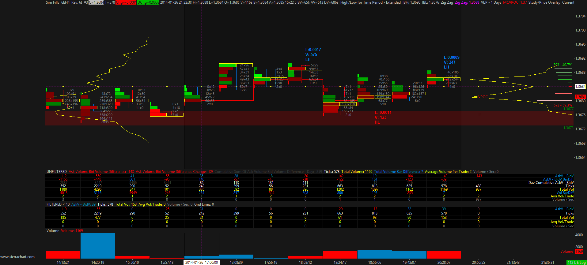 Regarding the above, I have a Numbers Bar chart set up which is unfiltered (volume). For this I have a Numbers Bar Calculated Values (NBCV) graph below. I have then got a second chart, filtered by volume (e.g. exclude <10) with a NBCV graph below. I have copied the filtered chart NBCV graph via the 'Study/Price Overlay' indicator to the unfiltered chart. All the values that show up are correct, other than the 'Ticks' and by consequence the 'Avg vol/trade' values. I assume that when the volume filter is used in the chart settings, it excludes the trades of a certain size above/below the selected figure (e.g. < 10) however it does not exclude the Ticks that caused those trades - is this correct? Chart with example of the NBCV graphs uploaded below. You will notice that the 'Ticks'line is the same in both the Filtered & Unfiltered NBCV graphs and thus the Ávg Vol/Trade' line in the Filtered graph is unable to compute - leaving al '0's. http://www.sierrachart.com/image.php?l=1390793555277.png Thanks as always. |