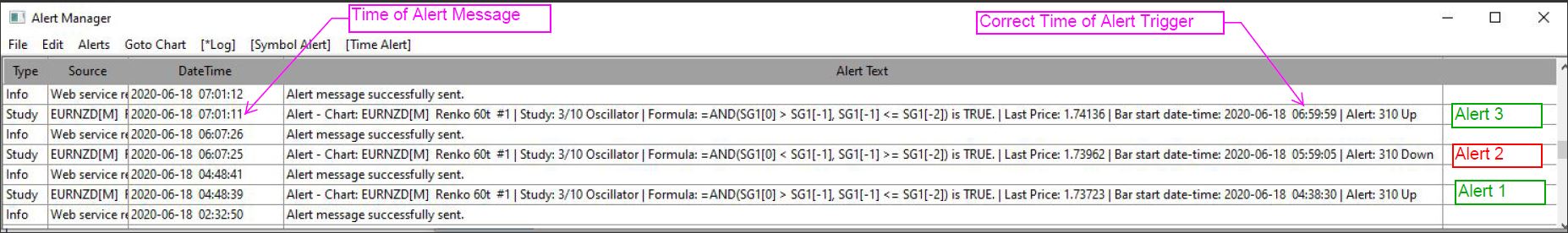 Hi, Is anyone able to assist in determining what may be the issue with the alerts I am using on the SC standard 310 Oscillator and a Renko Chart. I am using the following formula's. 310 Line turning up - =AND(SG1[0] > SG1[-1], SG1[-1] <= SG1[-2]) 310 Line turning down - =AND(SG1[0] < SG1[-1], SG1[-1] >= SG1[-2]) I have the alerts set to 'Evaluate on Bar Close'. Below is the alert message from the Alert Log, this is include din the attached images as 'Alert 3'. The 'Bar start date-time of 06:59:59' is correct (start of next bar after close of upturn 310 line) however the alert does not get sent until the close of the following bar 7:01:11. At times the alerts are sent 2 bars later or in the case of the attached 'Alert 1' this is sent at the correct time but the alert trigger time is 1 bar early which should not have be a correct alert. Alert - Chart: EURNZD[M] Renko 60t #1 | Study: 3/10 Oscillator | Formula: =AND(SG1[0] > SG1[-1], SG1[-1] <= SG1[-2]) is TRUE. | Last Price: 1.74136 | Bar start date-time: 2020-06-18 06:59:59 | Alert: 310 Up Can anyone point me in the right direction to resolve this alert timing issue? |