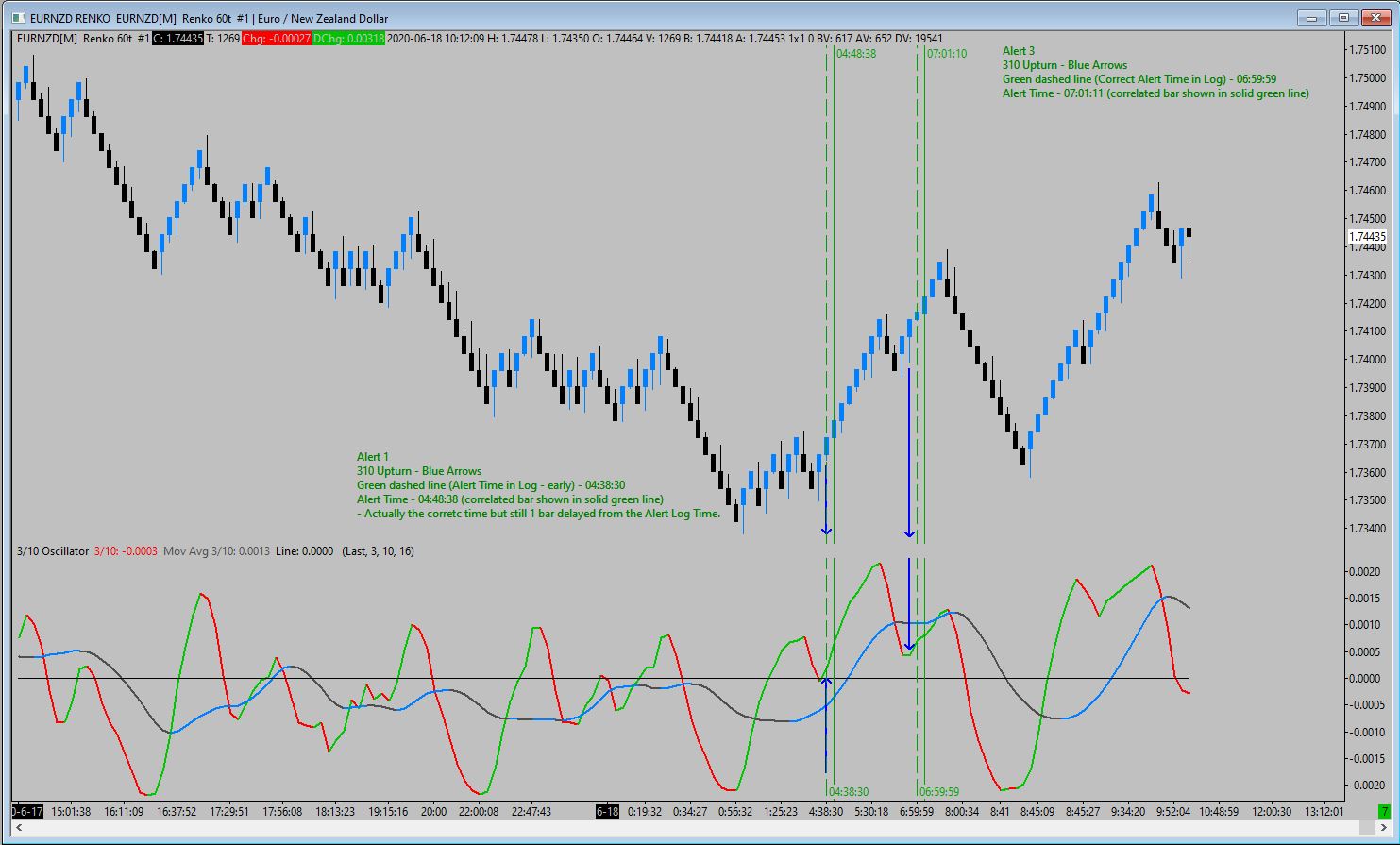 I can think of two possible issues: 1) To accurately determine the 3/10 line's upturn and downturn, you'll need to convert this formula...: Spreadsheet Example Formulas and Usage: Formula that Matches the Slope Coloring of a Study Subgraph Line ...to Simple Alert syntax, and use it in the Spreadsheet Formula study to return a 1 for upslope, and a -1 for a downslope. Then your alert formulas would look for the transitions from -1 to 1 and 1 to -1. 2) Renko bars are funky, especially the current one. You'll need to use the Spreadsheet Formula (Bar) study to create corrected Renko bars that use the Renko open and close, but not in the current bar. Then base the 3/10 study on this study. The details of each of these are too complex to deal with in a forum post. You can private message me for more info if you like. |