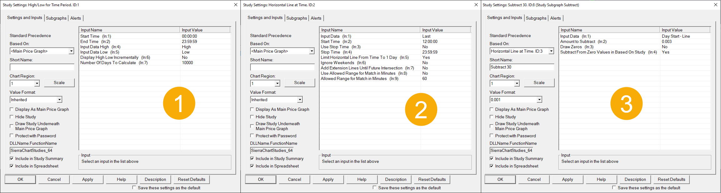 Look at the screenshot. Number 2 and 3 work together because I can set number 3 to subtract from number 2 and that draws a line on my chart. BUT I cant subtract from high/low for time period because it only has a high and a low setting. I need to subtract from the midpoint. I can get around this but that involves a whole bunch of other studies and it starts getting confusing. So if the high/low study simply had a midpoint it would be very convenient. |