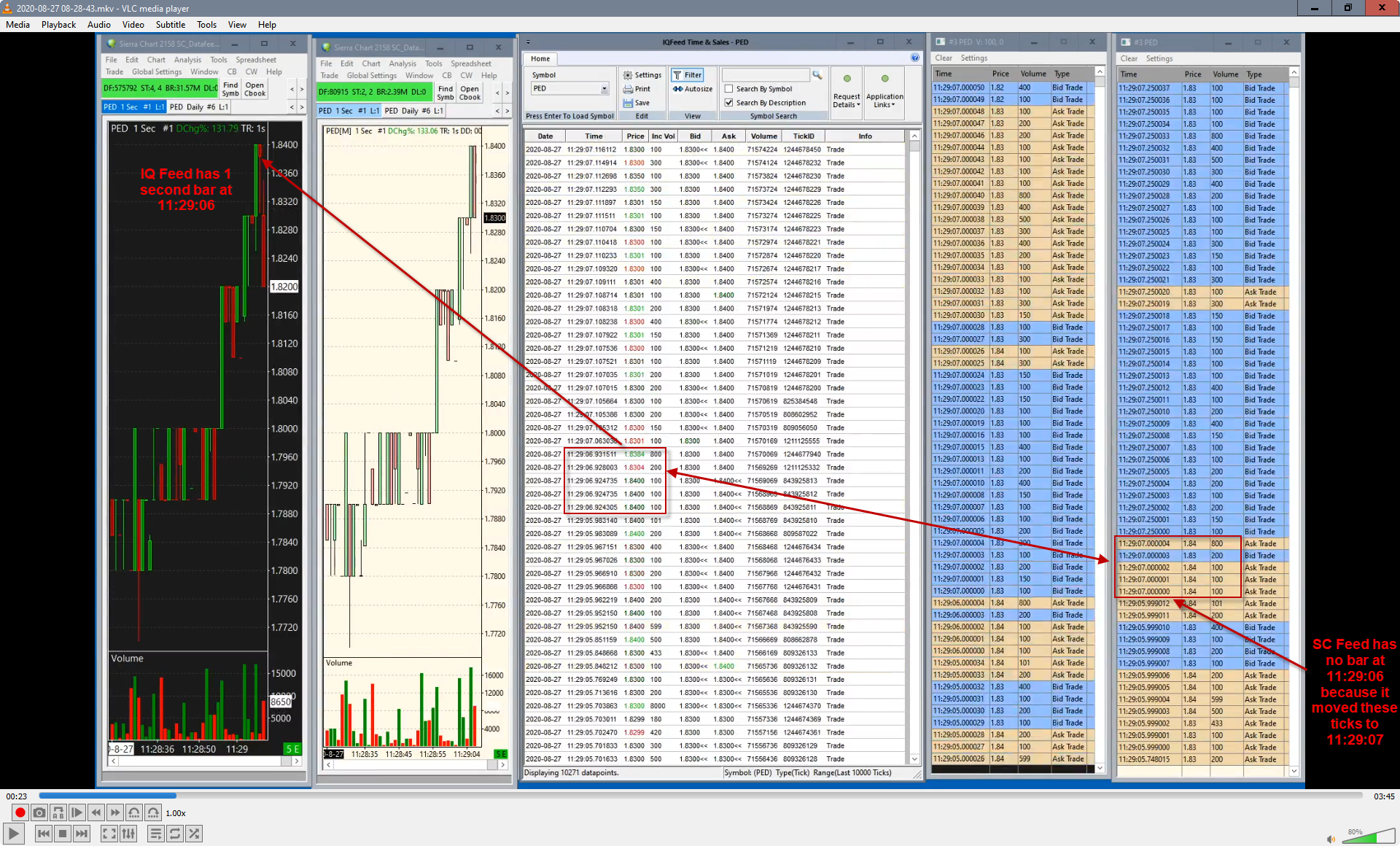 I tested out the latest version of SC with your SC Data Feed. It seems to be working pretty well. I have compared against IQ Feed in second instance of SC, and Thinkorswim, and so far I have seen the following issues: 1. There still appears to be a slight difference in timestamps with the SC data feed that causes some ticks to be included in the wrong bar. It looks like all the data is making it into the charts, but your time and sales is reporting the wrong timestamps - yours are rounded to some strange values that look like a combination of a rounded decimal value and a counter (i.e. 11:29:07.000000, 11:29:07.000001, 11:29:07.000002, 11:29:07.250000, 11:29:07.250001, 11:29:07.250002). Most of the ticks make it into the correct 1 second bar, except maybe 3% of the time ticks that have actual fraction of a seconds like x.9xxxxx in IQFeed get bumped into the following second. Just as a point of reference, when testing 1 minute candles the SC using IQFeed matches what TOS is drawing, so this suggests that the SC Feed is off. 2. It seems like the SC data feed is slightly slower than the IQ Feed. This might not matter to some people, but I'm looking to scalp hot stocks at the market open, so this is very important to me. I have both instances of SC set to 10 ms update interval, and the SC instance that is using IQ Feed updates as fast as 17 to 50 ms (I recorded video at 60fps, so there might be some variance here.) While the SC data feed appears to be updating around 217 to 267 ms. 3. I also experienced some pauses that lasted several seconds in both data feeds this morning. The tape on the stock I was watching was going really fast, so that might explain why things choked up. I also had both SC instances running since the prior day. I plan on retesting this tomorrow after a fresh reboot to ensure that the pauses aren't a regular thing on the market open. Hopefully we can get these issues resolved and then there would be no reason for me to use IQFeed. Thanks for all your hard work! |