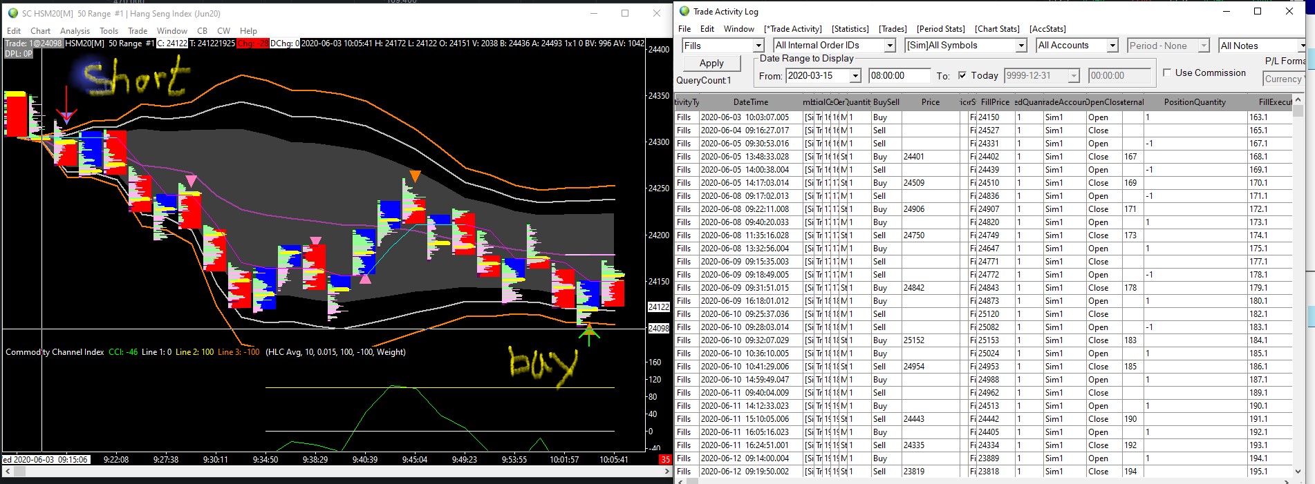 Hi, I just started using Sierra Chart not too long ago. Please don't mind I'm getting help on following issues as I found it difficult to dig out exactly what I want from the past posts. I am working on spreadsheet for trading and I've successfully set up the "buy entry", "buy exit", "sell entry" and "sell exit" rules. The "buy" and "sell" arrows are displayed correctly on the chart. However, when I look further to the "trade activities", (please see images attached) the trades don't match the buy/sell signals. On Image1, I should enter a short position around 9:15 but in "trade activity" my first trade is a buy at 10:03 (which is my second trade on Image1). It just skipped the first trade. Image2, is continuation and around 14:00, I should get a sell signal but it skipped again. I suppose with the long position I'm in, I already have a "buy exit" setup in excel which is Last Price > VWAP Band and should have got me out of the trade already. So the problem I'm having is that the "buy exit" condition does not get me out of the position and some of the buy/sell signals were completely skipped. Furthermore, I have other questions relating to automated trading 1. How to place Stop buy order? I notice at J71 there's M,L,S etc. but how do I use it if I want to specify to Buy Stop at (Low of this bar + 30 points)? 2. I've read the Attached Order function and got basic understanding of it. For my system, all I need is a general stop loss and trailing stop. But at the same time, I would like to use my condition in "buy exit" to take loss or take profit. How do I use both at the same time? Or are they mutually exclusive? If I use Attached order, I must stick with the set of profit target, Stop loss, Trailing Stop etc.? 3. I would like to enter 4 contracts at once and exit each by different targets. How can I do that? Really appreciate it if you can answer my questions. I've been stuck for a few days and I would like to move on asap. Thanks |