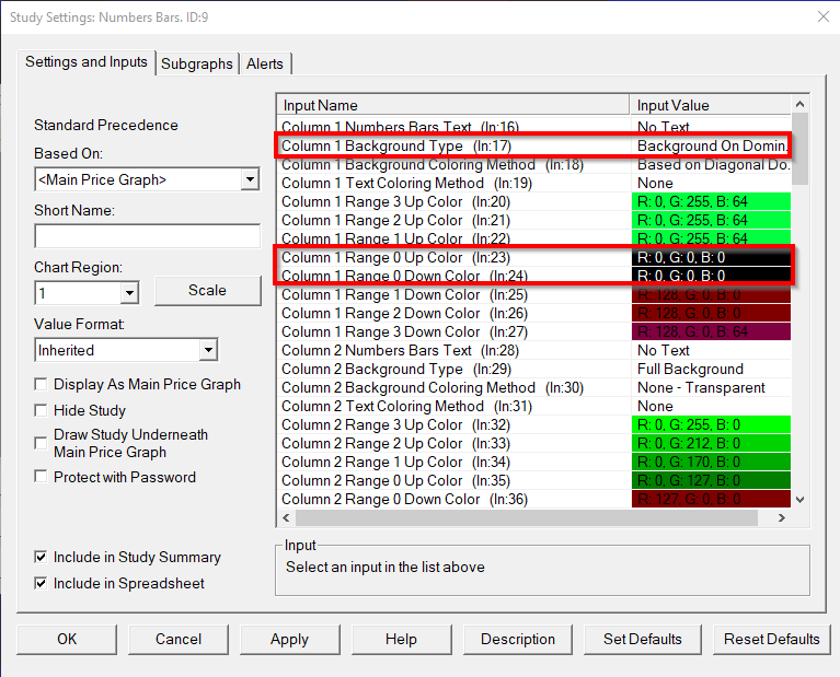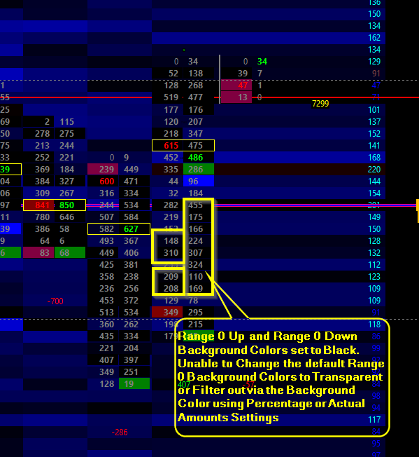 @Sierra Chart Engineering I have the Numbers Bars study overlaied on the Market Depth Historical Graph Heatmap on my chart with the Background Type set to "Background on Dominant Side". I am able to filter change what Background Colors appears for Range 1,2, and 3 Up and Down Colors by using different values for percentage and actual Background Coloring Methods. However, the Range 0 Up and Range 0 Down Colors cannot be filtered out based on the 3 filtering options in the Percentage or Actual Amounts settings in Numbers Bars. Currently, I just change the Range 0 Up and Down Colors to black to make the colors inconspicuous but the black color option still covers the Market Depth Historical Graph Heatmap underneath (see attached). I would like to have the Dominant Backgrounds that are colored based on the Range 0 color settings appear as transparent so that no background appears for values that do not meet my filtering criteria in the Numbers Bars study. Numbers Bars: NumbersBars Calculated Values Background Coloring Example I am aware of the "None - Transparent" background coloring option but it does not appear that there is a transparent color setting available in the Basic or Custom Colors of the Color settings. Would you be able to provide a checkbox or a Yes or No field that would change the Range 0 Up and Down Colors to Transparent? Or possibly add a transparent color option to the Sierra Chart color palette so that users can select the "Transparent" color option when they do not want to display a specific background or text. Thank You |