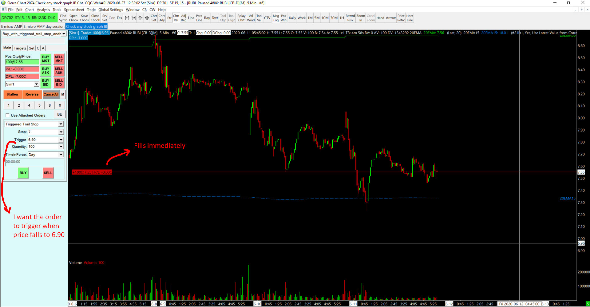 Hi, I am not able to get triggered trail stop to work as a main BUY order (with no attached orders) So for example if the current market price is 7.55 and I use order type 'Triggered trail stop' with a 'stop price of 7' and 'Trigger' price as 6.90, AND I hit BUY; the order fills IMMEDIATELY at current market price i.e. 7.55 This is not what I want. I want the trailing action to begin when the market price falls to 6.90 and then the BUY order to chase the market price with an offset of 5 ticks. Can you please help as it's an important part of my strategy? See attached screenshot http://www.sierrachart.com/image.php?Image=1593225483598.png Thanks V |