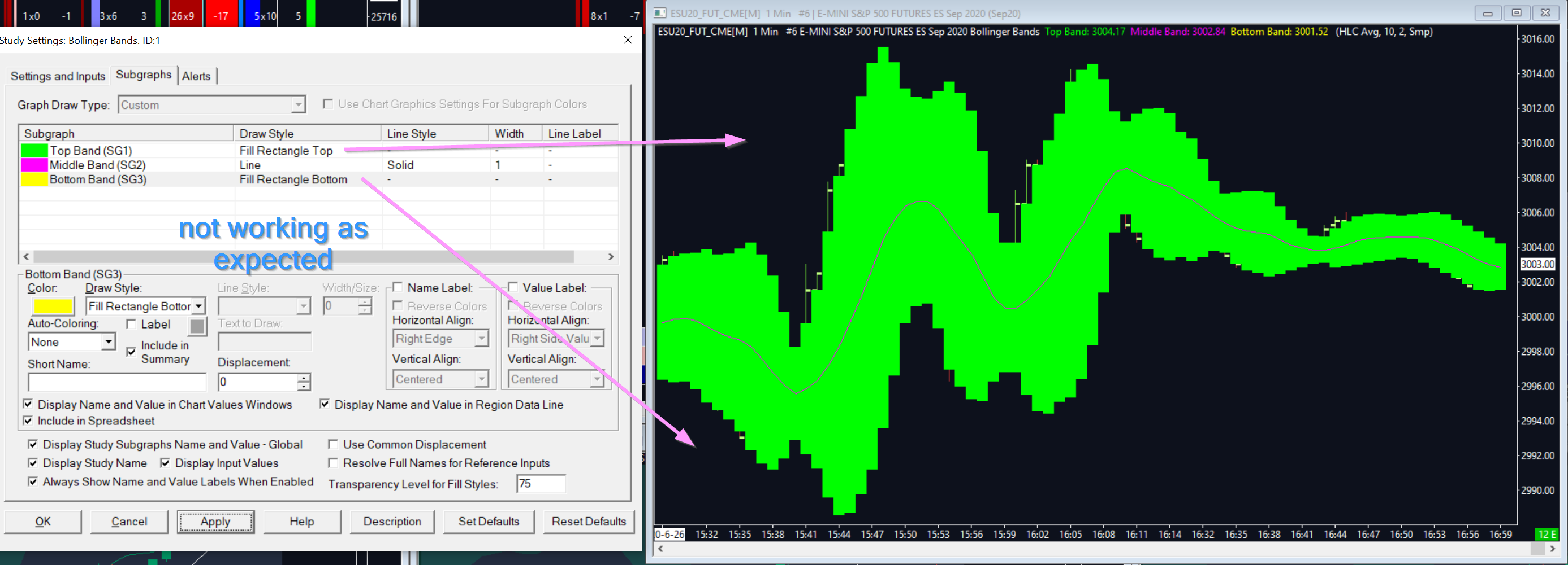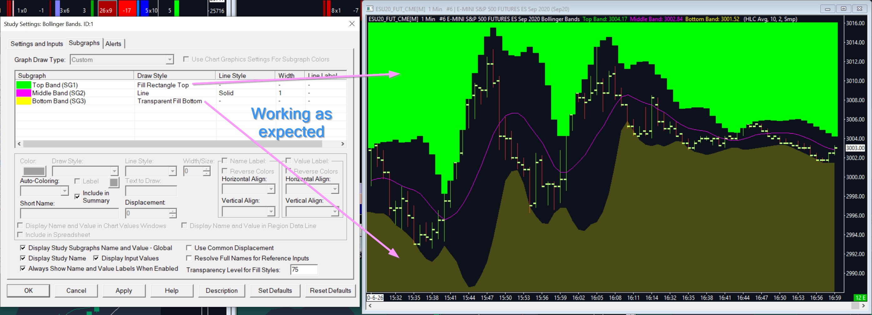 Hi, I'm trying to use the bollinger band and changing the draw style to fill the top and fill the bottom at the same time. If I use the same type of draw style to fill the top and bottom, it doesn't work as expected. If I pick different types of fills for the top and bottom, then it works as expected. Attached are screenshots. Is this a bug or just how it is? I'm using a workaround of using 2 studies and one fills the top and one fills the bottom to get it how I want it to look. Thanks. |