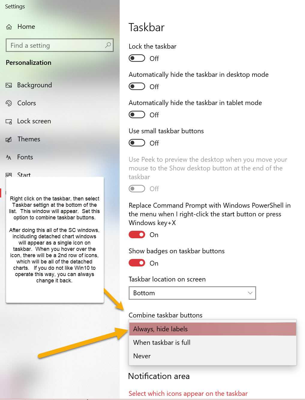 If you change the way Win10 shows icons, you can only see one icon per similar windows. Right click on the taskbar, then select Taskbar setting at the bottom of the list. This window will appear. Set this option to combine taskbar buttons. so, all copies of a program / window will be combined / stacked into one icon on the taskbar. Example -- if you have 3 copies of File Explorer open, there will be one File Explorer on the task bar. Clicking the FileExplorer icon in the win10 taskbar, will make a 2nd row of icons appear above it, of the actual instances "windows" of file explorer. If you have SC charts as detached, then after doing this all of the SC windows, including detached chart windows will appear as a single icon on taskbar. When you click over the icon, there will be a 2nd row of icons, which will be all of the detached charts. If you do not like Win10 to operate this way, you can always change it back. Hope this makes sense. JohnR Date Time Of Last Edit: 2023-03-21 15:15:45