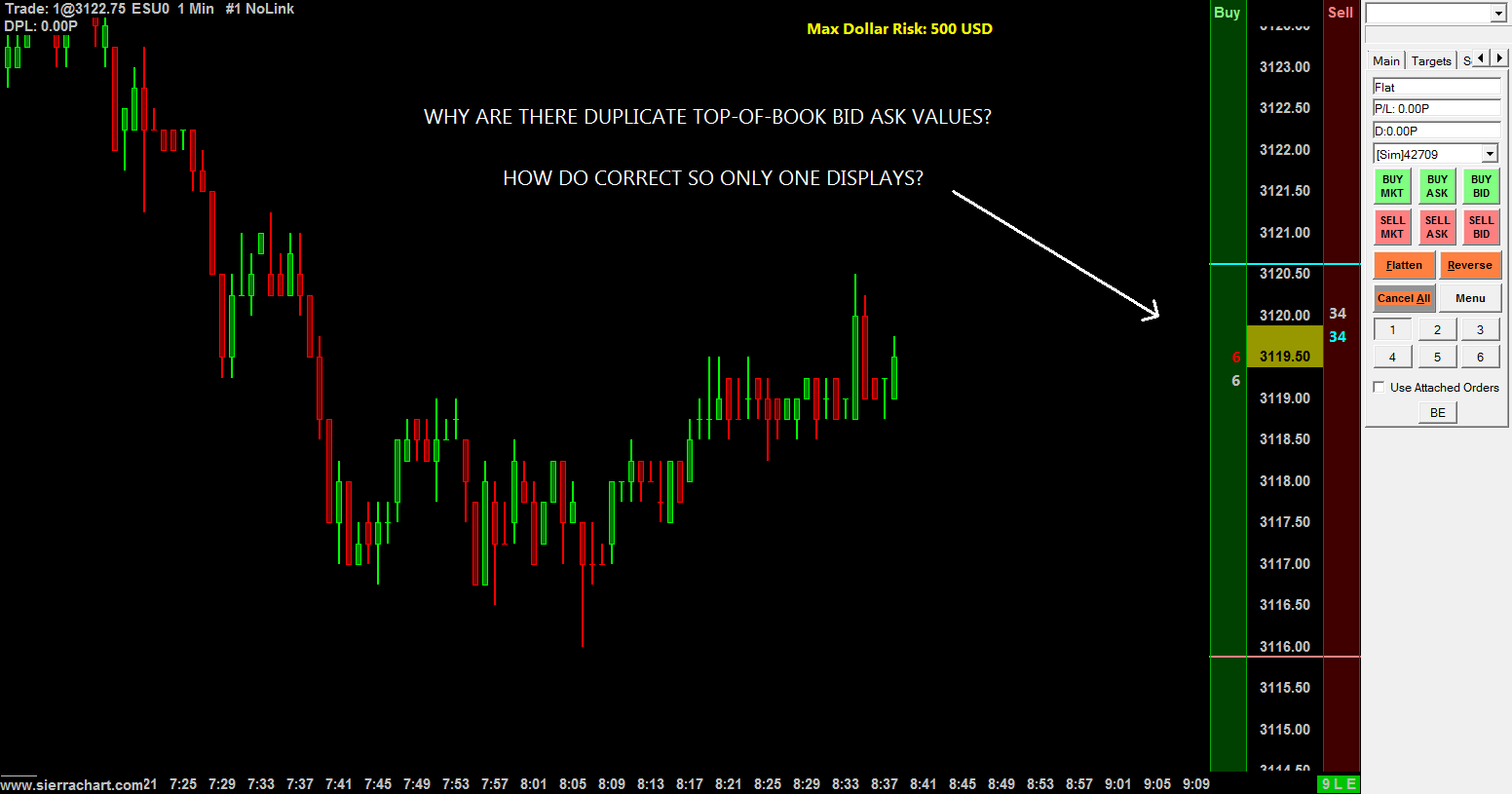 Greetings, Chart DOM is displaying duplicate Top-of-Book Bid/Ask values...How do I remove them so only one displays? Thank you...David http://www.sierrachart.com/image.php?Image=1593779936884.png http://www.sierrachart.com/image.php?Image=1593793410794.png Date Time Of Last Edit: 2020-07-03 16:25:46