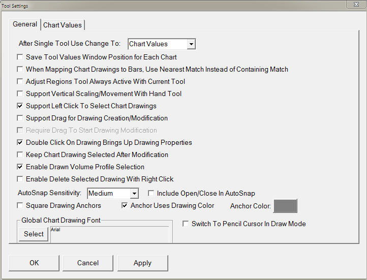 You need to have either the Pointer or Chart Values tool to be able to select an existing drawing. A tool draws a drawing. So there is the Tool and then the resulting tool drawing. What you write something on a piece of paper with a pen or pencil, do you call the writing a pen or pencil. Of course not. Sierra Chart Support - Engineering Level Your definitive source for support. Other responses are from users. Try to keep your questions brief and to the point. Be aware of support policy: https://www.sierrachart.com/index.php?l=PostingInformation.php#GeneralInformation For the most reliable, advanced, and zero cost futures order routing, *change* to the Teton service: Sierra Chart Teton Futures Order Routing Date Time Of Last Edit: 2014-01-29 06:23:32