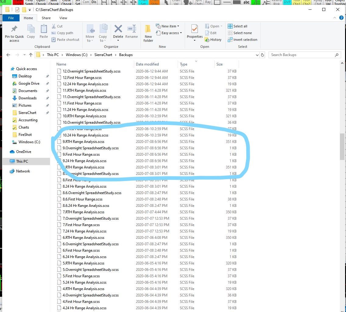 I have 4 spreadsheets in a chartbook. (RTH, OVN, 24HR, 1stHR) They have been working fine until I upgraded to SC Ver. 2031. Using SC Ver. 2031 three of the 4 spreadsheets (OVN, 24HR, 1stHR) are saved empty even though they function properly prior to updating to SC 2031. I have tried restoring the spreadsheets and they will work properly until I restart SC after which they are saved empty. I went back to the previous version SC 2030 and restored the spreadsheets and everything saved and worked properly after exiting and restarting SC. Attached are two screenshots of the files in the SC Backup directory using the two SC versions (2030 & 2031). Halfway down the screen are the July 9th (RTH, OVN, 24HR, 1stHR) spreadsheets. On version SC 3031 the file sizes are 1 KB.