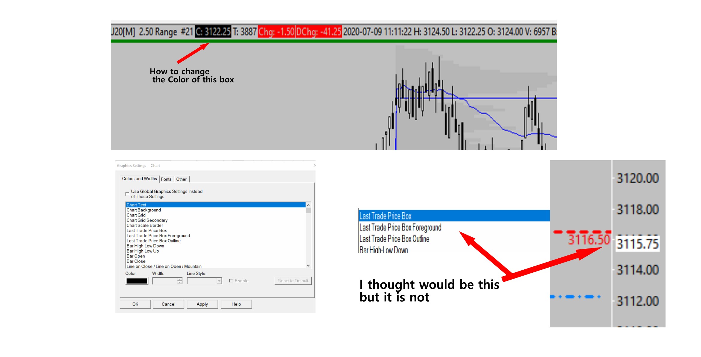 You cannot change the color of that box in the header line. It is automatically selected to be the reverse of the color of the Chart Text color. You can remove that background if you like, refer to the information here: Working With Charts: Chart Header Text Colors You can only independently control the color of the Last Trade Price box in the values scale. Sierra Chart Support - Engineering Level Your definitive source for support. Other responses are from users. Try to keep your questions brief and to the point. Be aware of support policy: https://www.sierrachart.com/index.php?l=PostingInformation.php#GeneralInformation For the most reliable, advanced, and zero cost futures order routing, *change* to the Teton service: Sierra Chart Teton Futures Order Routing Date Time Of Last Edit: 2020-07-09 20:28:34