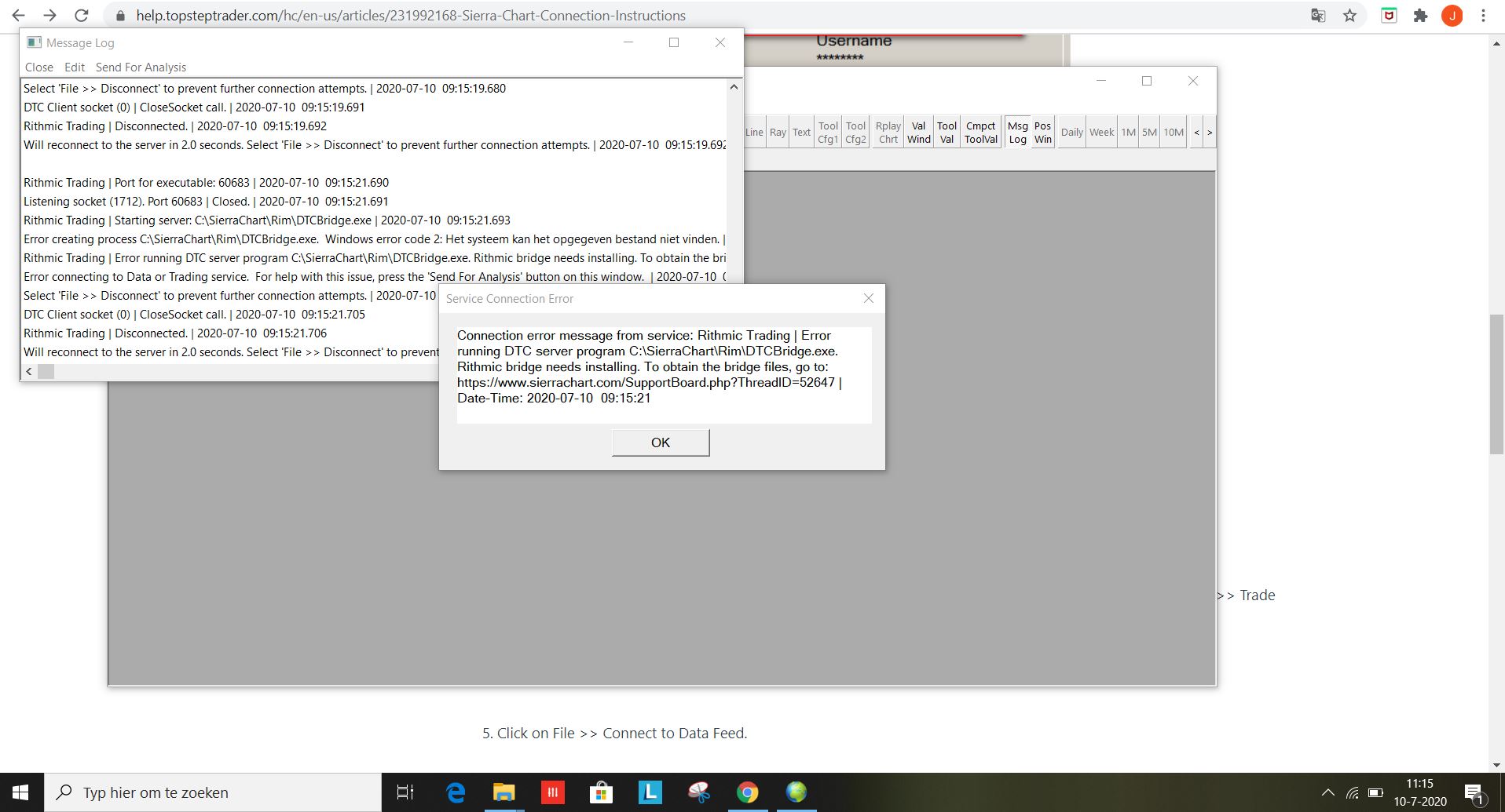 I downloaded the Sierra software and tried to connect to my data trading account (Topsteptrader) but it failed. Please find enclosed screenshot of the error message. I hope you can help solve the problem. Thanks! Kind regards, Jack Date Time Of Last Edit: 2020-07-11 11:44:04