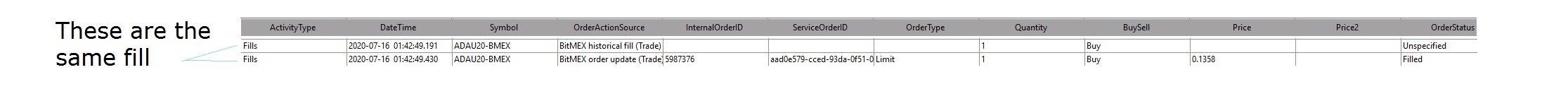 What is clear is that this is a BitMex specific issue. Apparently something has changed on the BitMex side, where there are two fills being sent per single fill. This does not make sense. A problem like this does not exist with any other supported trading service. We do not know when this problem began. It is not something we can spend any time on anytime soon. It is BitMex specific. Otherwise there will not be a problem at all. ---- Your Sierra Chart account which you have logged into this Support Board with is expired. So we know what Sierra Chart account you are using, go to Help >> Support Board from within the Sierra Chart desktop program and then post in this thread telling us this is done. Sierra Chart Support - Engineering Level Your definitive source for support. Other responses are from users. Try to keep your questions brief and to the point. Be aware of support policy: https://www.sierrachart.com/index.php?l=PostingInformation.php#GeneralInformation For the most reliable, advanced, and zero cost futures order routing, *change* to the Teton service: Sierra Chart Teton Futures Order Routing Date Time Of Last Edit: 2020-07-18 10:49:56