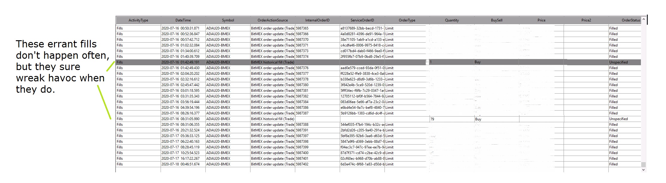 After additional investigation, it seems that these errant fills are historical fills. For past fills (from hours to days prior) that are to be drawn on the chart, this is okay. But these historical fills sometimes show up for new trades (usually around 300ms before the correct fill message), which confuses Sierra Chart into seeing two fills instead of one. (See screenshot attached.) A simple solution would be the ability (via check box or similar) to disregard historical fills. (My partner and I have an updated and fully paid version of Sierra Chart under a different account. I just happen to have this login memorized, which is why I often choose to use this one. If it's important to you, then I'm happy to use the other one going forward. I will send you a separate email at support@sierrachart.com to discuss another somewhat related issue that demands more discretion.) Date Time Of Last Edit: 2020-07-19 07:24:34