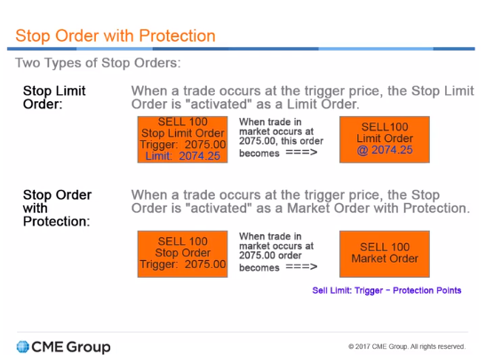 Thanks, ondafringe! After watching the video, at 5:04, it looks like the CME distinguishes between two orders, a stop limit and a stop order with protection. How do we use the stop order with protection in Sierra? The stop limit doesn't seem to stop you out at your stop price (with a market order) but rather at the limit price which is set - in my case for MGCQ20, it was 4 ticks and in another case, it was 5 points! A stop order with protection will do as you mention above, a market order that sweeps the book until it hits the protection price and then a limit price is set for the rest of the unfilled order. |