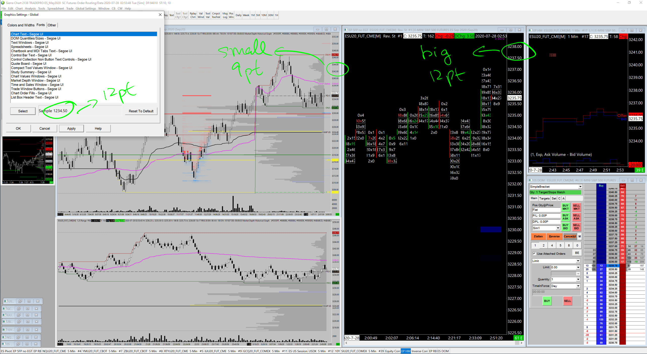 I went to Global Settings->Graphics Settings - Global, selected the Fonts tab and highlighted Chart Text - Segoe UI and changed font size from default of 9 to 12, but that only changes some of my charts. For example my heatmap and footprint charts with ES shows the larger font size, but my 10 and 5 tick range chart still shows a tiny font on the y-axis (the price axis). What went wrong? Thanks!