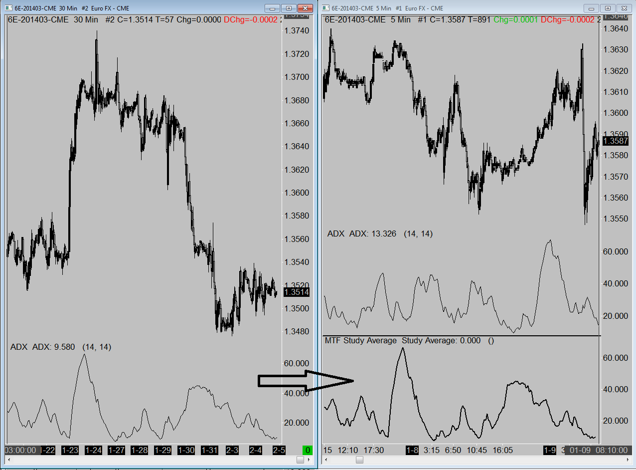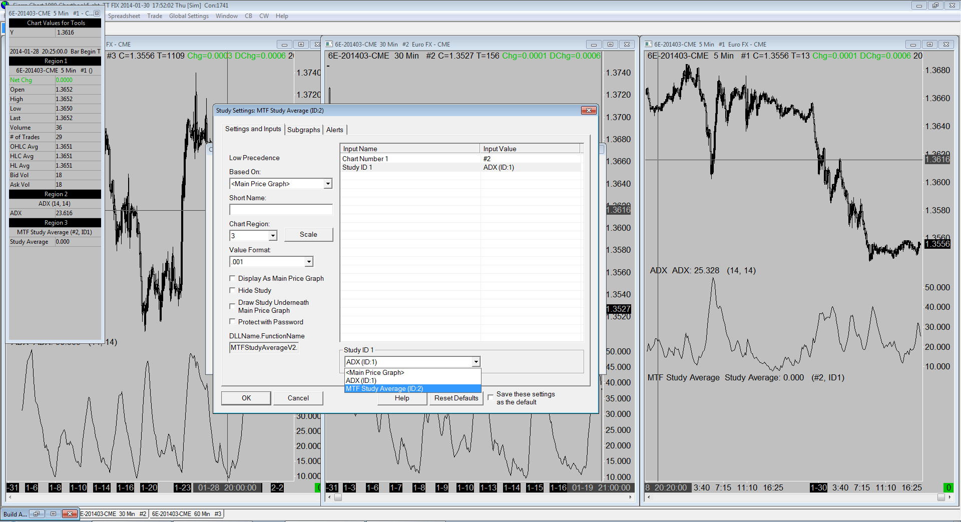 Hi, revised the code as indicated, but I am still having same exact problem. I know I am missing something obvious, I just can't figure it. Sorry, thanks again for any help. #include "sierrachart.h" SCDLLName("MTFStudyAverageV2") /*==========================================================================*/ SCSFExport scsf_MTFStudyAverageV2(SCStudyInterfaceRef sc) { SCSubgraphRef Average = sc.Subgraph[0]; if (sc.SetDefaults) { sc.GraphName = "MTF Study Average"; sc.FreeDLL = 1; sc.AutoLoop = 1; sc.CalculationPrecedence = LOW_PREC_LEVEL; Average.Name = "Study Average"; Average.DrawStyle = DRAWSTYLE_LINE; Average.LineWidth = 2; Average.PrimaryColor = RGB(0,0,0); //sc.Input[0].Name = "Chart Number 1";; //sc.Input[0].SetInt(2); //sc.Input[1].Name = "Study ID 1"; //sc.Input[1].SetInt(1); sc.Input[0].SetChartStudyValues(2, 1); return; } int ChartNumber = sc.Input[0].GetChartNumber(); int StudyID = sc.Input[0].GetStudyID(); SCGraphData StudyData; sc.GetStudyArraysFromChartUsingID(ChartNumber, StudyID, StudyData); if(StudyData.GetArraySize() == 0) return; SCFloatArrayRef SubgraphArray = StudyData[0]; if(SubgraphArray.GetArraySize() == 0) return; Average[sc.Index] = SubgraphArray[sc.Index]; } Date Time Of Last Edit: 2014-02-04 22:47:24