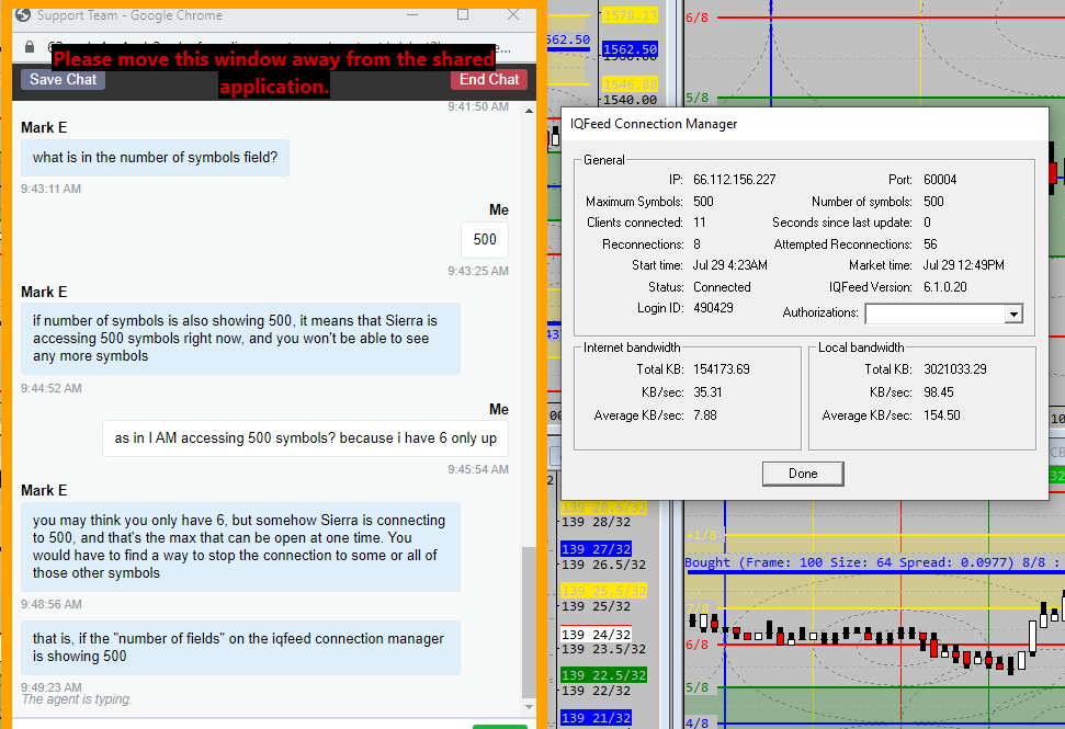 weird problem, attached is IQfeed's reply 1 have 6 tickers up 4 giving me data, 2 are not. IQfeed said that seirra is requesting data for over 500 tickers, as attached screenshot of iqfeed connection manager I have 6 tickers open only pease help me resolve this issue, i have no idea why Sierra would be requesting all these tickers, i am not running any fancy indicators, scanners etc, none. because seirra is requesting over 500 tickers, the 2 i am not getting data for, will not populate data, im "maxed out" i literally have 6 tickers open on a chartbook, how do i fix this error? THANK YOU IN ADVANCE!!!! |