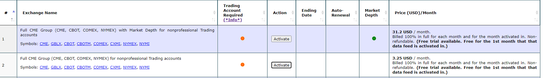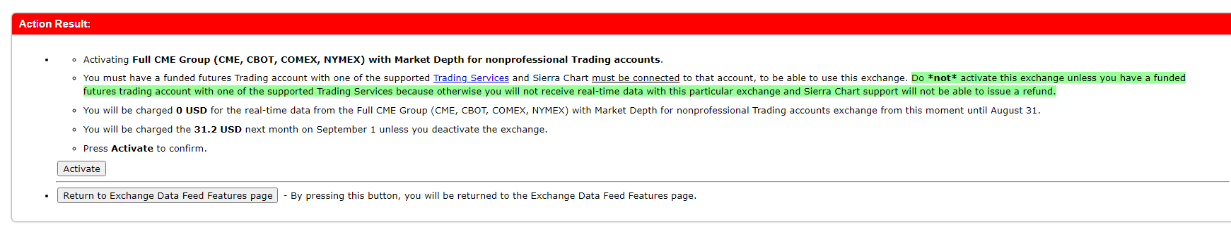 You can proceed with the exchange activation. What you want is supported but you do need to connect once a month to your trading account. Refer to: Real-Time Exchange Data Feeds Available From Sierra Chart: Connecting Only Once a Month to Trading Account to Support CME Group Exchange Fees Sierra Chart Support - Engineering Level Your definitive source for support. Other responses are from users. Try to keep your questions brief and to the point. Be aware of support policy: https://www.sierrachart.com/index.php?l=PostingInformation.php#GeneralInformation For the most reliable, advanced, and zero cost futures order routing, *change* to the Teton service: Sierra Chart Teton Futures Order Routing Date Time Of Last Edit: 2020-08-01 12:14:28