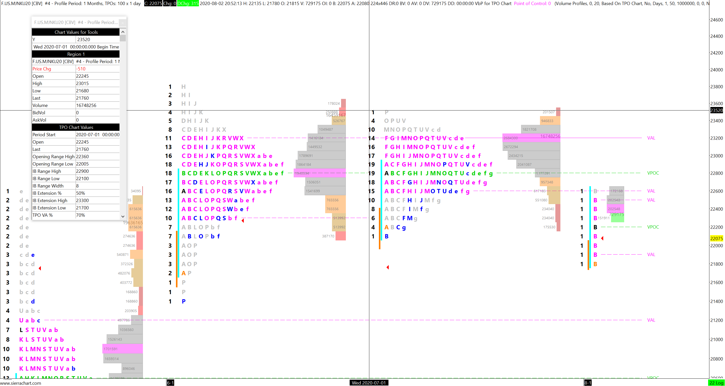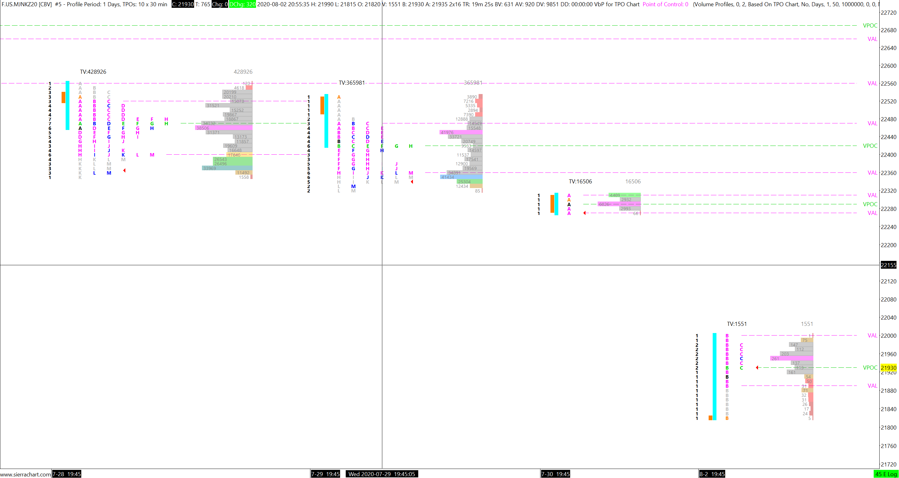 Hello, See below referenced screen images: http://www.sierrachart.com/image.php?Image=1596415934934.png http://www.sierrachart.com/image.php?Image=1596416147180.png - in the first screen image my question is, why is the tool values window reflecting inaccurate high/low figures for the month of July? - in the second screen image my question is, why is there missing data for Thursday 7/30 19:45 session (Friday 7/31 in Japan); as you can see A period registered then there is a gap over the weekend and B period proceeds in today's opening session (Sunday 19:45 8/2/20 [Monday 8/3 in Japan]) Am I missing something in terms of how my charts are set up or how this particular instrument functions? Thanks for your help |