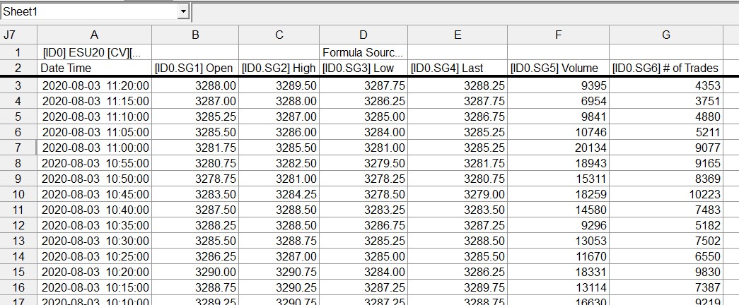 These are automatic. As long as you have a chart with candles on it, attaching a spreadsheet study to the chart populates columns A through G with Bar Data. Each bar is one row starting at row 3, and working down in descending time order. The Date/Time of the bar open is in column A. Open in B, High in C, Low in D, and Last (Close) in E. Finally Volume and Trades are in F and G. |