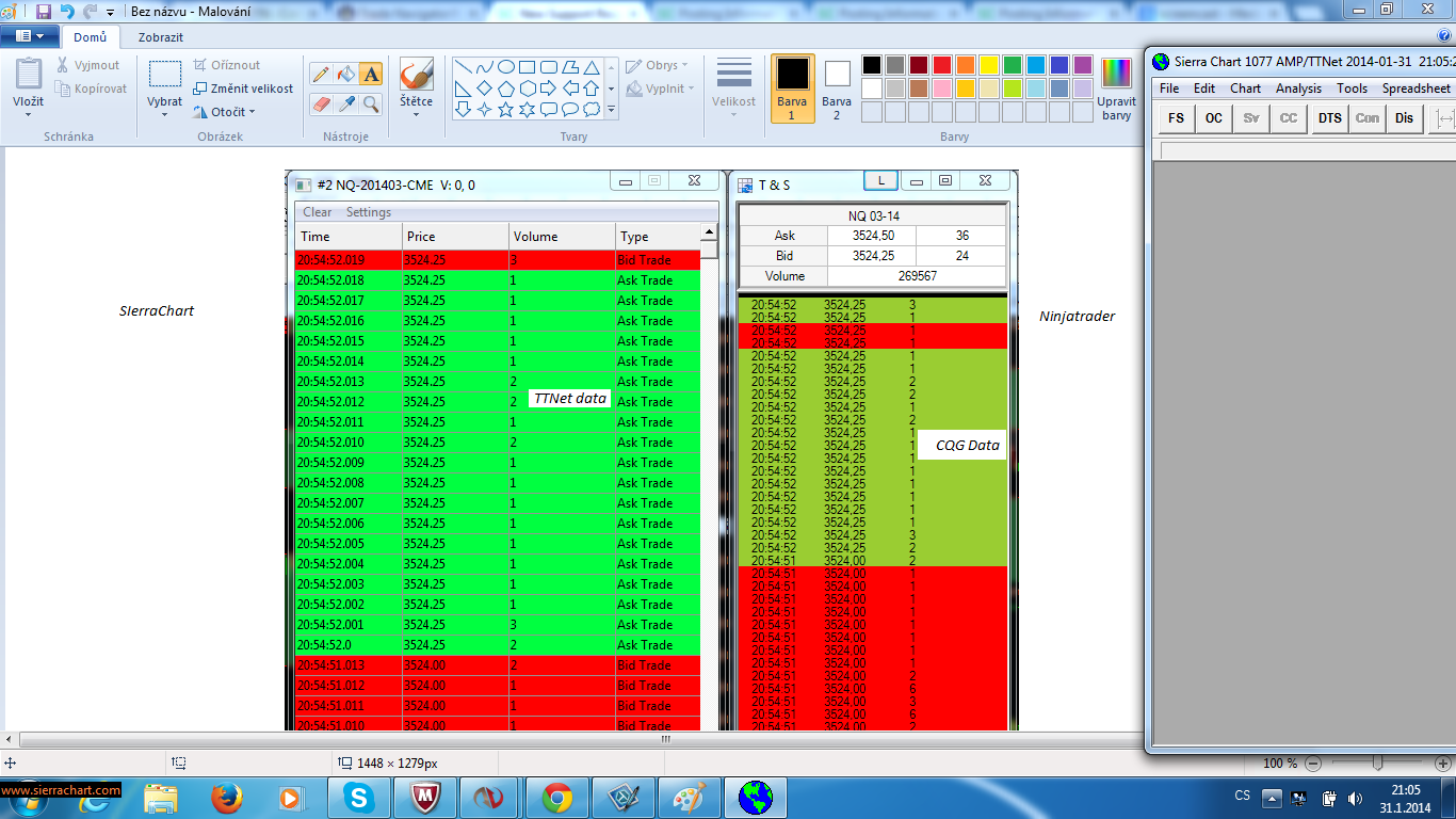 Good afternoon, I have tried to compare CQG data from Ninjatrader to TTnet data in Sierrachart and I have found big differences in TIME and Sales window. I am enclosing screen of it and asking how it´s possible to have two different Time and Sales. I understand it´s Ninjatrader, however which data are correct? Many thanks for your help Regards Jakub Malchar P.S. : The differences were seen in NumberBars too(footprint) http://www.sierrachart.com/image.php?l=139119872884.png |