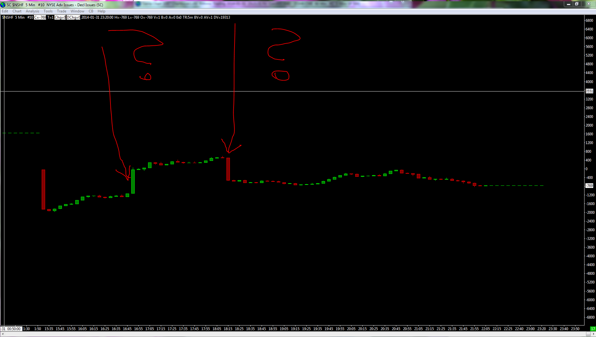We think we know now what you are trying to show, there was a calculation problem on January 31 with the market statistics. This is probably why you notice what appears to be a sudden increase in the Advancing issues minus the Declining issues and then it goes back down. A problem like this is going to be solved with the new versions of these statistics. Sierra Chart Support - Engineering Level Your definitive source for support. Other responses are from users. Try to keep your questions brief and to the point. Be aware of support policy: https://www.sierrachart.com/index.php?l=PostingInformation.php#GeneralInformation For the most reliable, advanced, and zero cost futures order routing, *change* to the Teton service: Sierra Chart Teton Futures Order Routing |