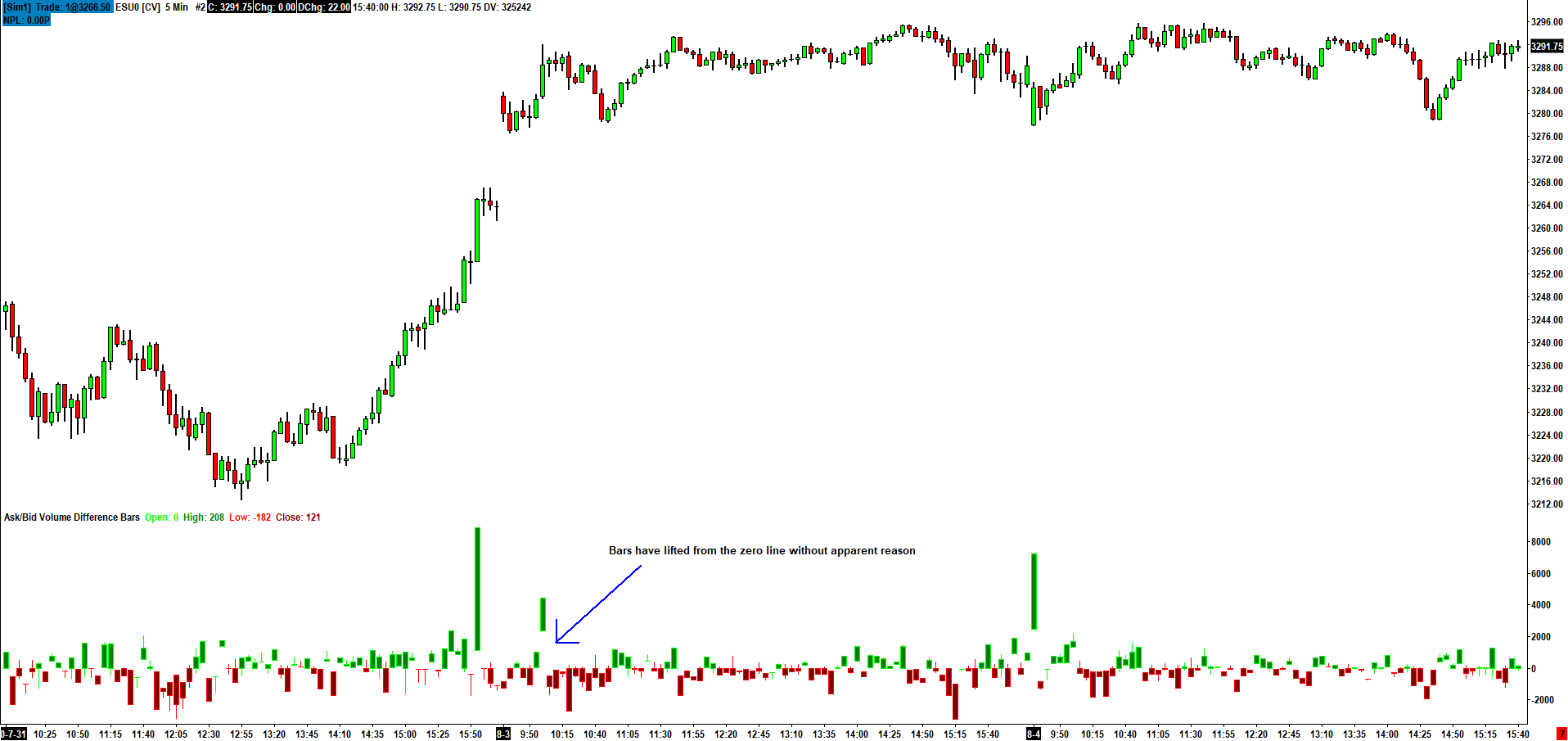 We have looked into this, and we will document why this is the case. It is not known what the opening Ask Volume and Bid Volume difference is. The best that can be used is the prior close. The only exception is when the chart bars are set to 1 trade per bar. In that case the opening difference can be calculated. So the open value is set to 0. However, of 0 is outside the high to low range, the open is changed to the nearest value. Sierra Chart Support - Engineering Level Your definitive source for support. Other responses are from users. Try to keep your questions brief and to the point. Be aware of support policy: https://www.sierrachart.com/index.php?l=PostingInformation.php#GeneralInformation For the most reliable, advanced, and zero cost futures order routing, *change* to the Teton service: Sierra Chart Teton Futures Order Routing |