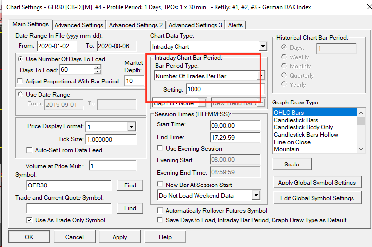 Refer to the information here for this Chart Setting: Chart Settings: Number of Trades Per Bar (Chart >> Chart Settings >> Bar Period >> Intraday Chart Bar Period Settings >> Bar Period Type) Sierra Chart Support - Engineering Level Your definitive source for support. Other responses are from users. Try to keep your questions brief and to the point. Be aware of support policy: https://www.sierrachart.com/index.php?l=PostingInformation.php#GeneralInformation For the most reliable, advanced, and zero cost futures order routing, *change* to the Teton service: Sierra Chart Teton Futures Order Routing Date Time Of Last Edit: 2020-08-06 18:45:56