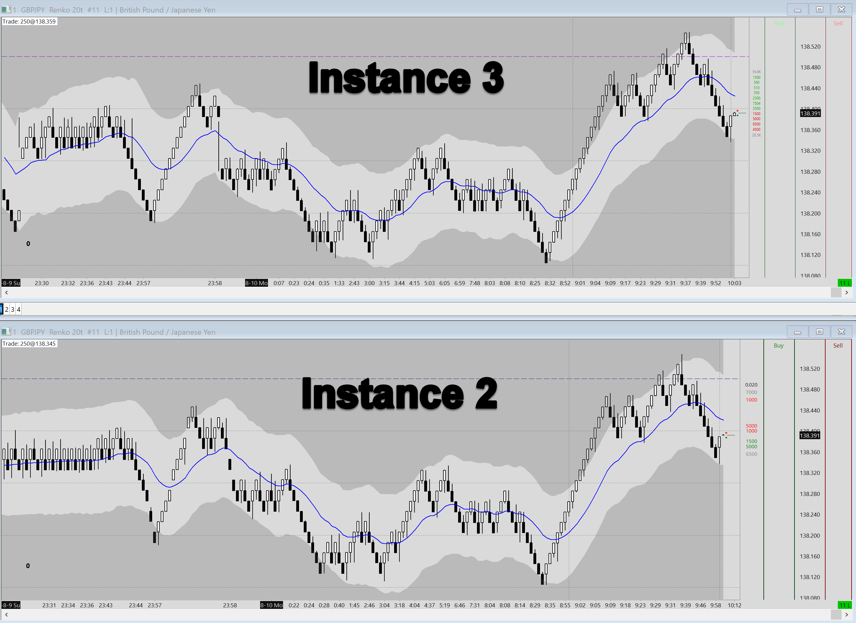 There are also significant differences in the DOM figures between the pairs and instances. In this example I have put GBPJPY identical charts on two different instances and taken snapshots side by side. As you can see in Instance 3 you are getting what looks like the correct depth, but in Instance 2 there are many missing levels. I have a number of examples like this.