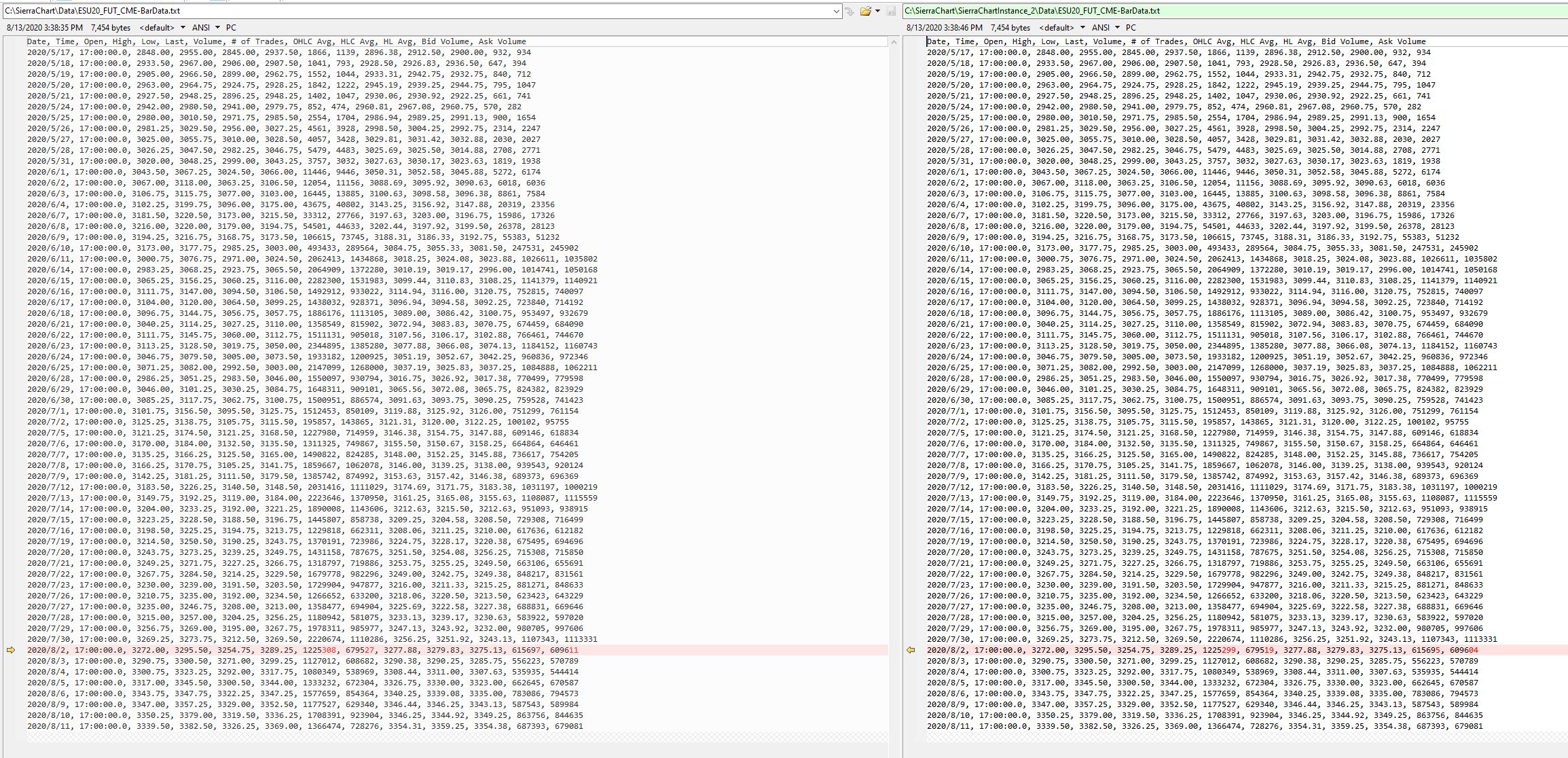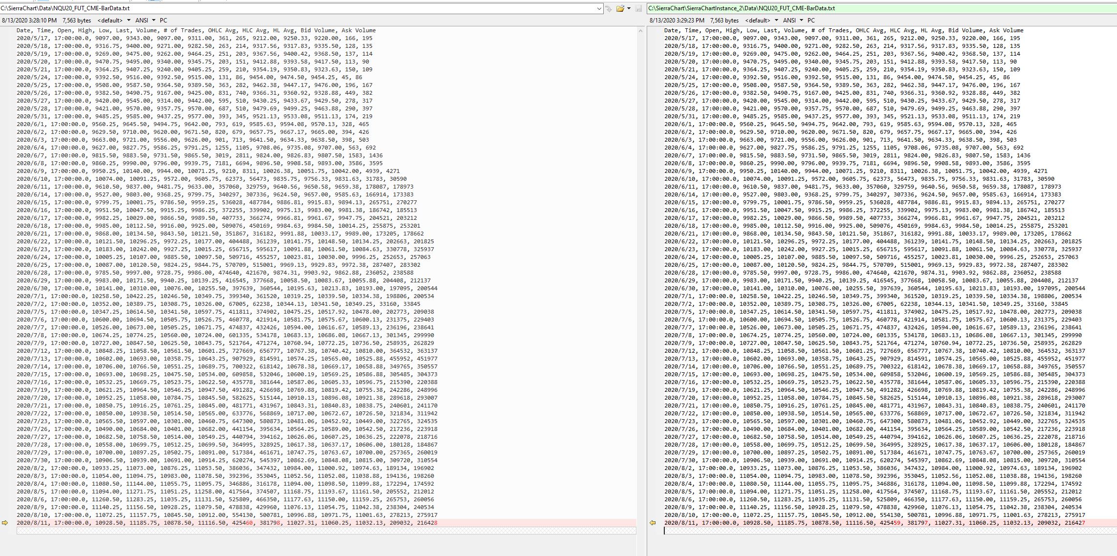 SC Team - Noticing few issues with the Number of Trades/Volume between Main instance and Sub-Instance. Attached are 2 images demonstrating the issue. If you could look at the data for the same bar - The End time/# of trades/Volume are different between Main instance and sub-instance. I have looked at the underlying T&S/SCID data between main instance and sub-instance and in sub-instance the data for 23:34:43.002 is missing where as it is present in main instance. 23:34:43.000 & 23:34:43.001 - Present in both main and sub-instances. 23:34:43.002 Trade: In Main Instance - Showed up in T&S data, Present in SCID file, Shows in Chart In Sub Instance - Showed up in T&S data, missing in SCID file, Missing in Chart This is a serious issue as unable to trust the Sub-Instance to process critical data. PS: I am using CST as timezone across the charts/instances for this. This is not a single occurrence as have been noticing the issues in different areas as well. Same code produces very subtle differences between main instance and sub-instance. Thanks Date Time Of Last Edit: 2020-08-12 05:09:13