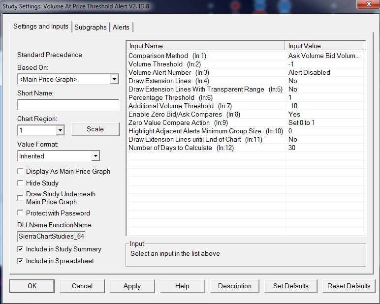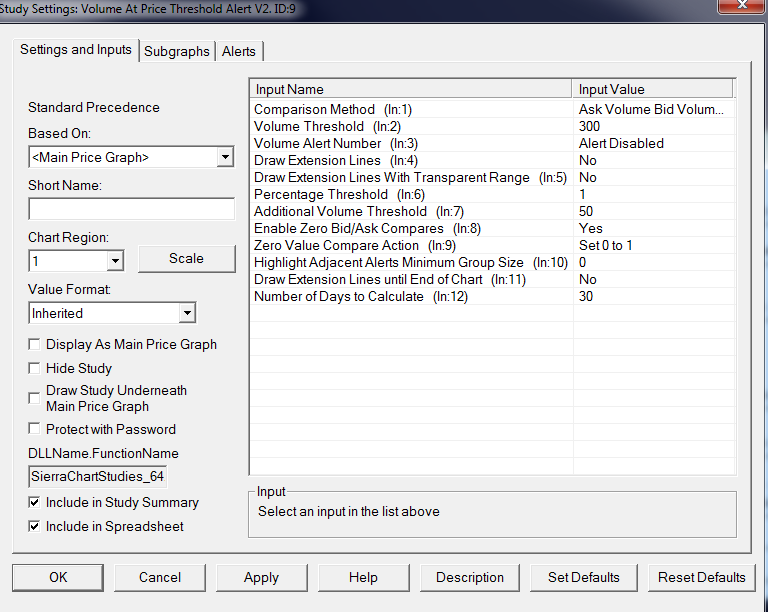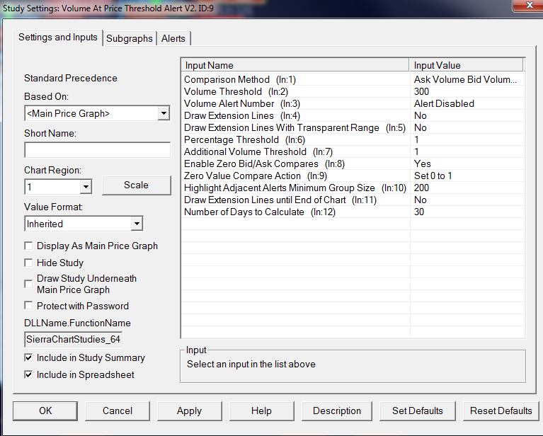 You just need to add a second copy of the Volume at Price Threshold Alert V2 and set the threshold to be -300. We noticed that this is not explained in the documentation, we will update that shortly. Sierra Chart Support - Engineering Level Your definitive source for support. Other responses are from users. Try to keep your questions brief and to the point. Be aware of support policy: https://www.sierrachart.com/index.php?l=PostingInformation.php#GeneralInformation For the most reliable, advanced, and zero cost futures order routing, *change* to the Teton service: Sierra Chart Teton Futures Order Routing |