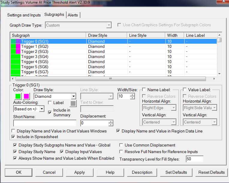 Hi I'm trying to use Volume at Price Threshold alert V2 in order to hilight on the number bars a delta > or < of a certain amount, for this purpose I've put as a Comparison Method: Ask Volume Bid Volume Difference in this case 300 as a Volume threshold, but it works only with positive deltas not with negative ones as you can see on the chart it doesn't hilight them as you see 706/30 or 1212/794 etc... are not hilighted... it seems it doesn't consider negative numbers of delta, am I doing something wrong or is it a bug? This is the result http://www.sierrachart.com/image.php?Image=1597265269157.png attacched the setings tks |