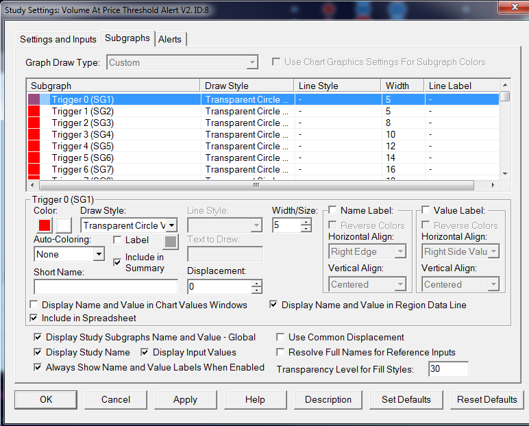 In the use of this indicator "Volume At Price Threshold Alert V2" (really with a great potential) I'm encountering further issues, I'm trying to build a chart with the delta throught this indicator, something like this: http://www.sierrachart.com/image.php?Image=1597404016690.png a chart made of delta circles, for this purpose I setted "Ask Volume Bid Volume Difference" at 1 and going up in order to see circles for every price, the bigger cirle the bigger delta, and so I tried both for positive delta and negative delta setting also "Additional Volume Thresohod" at 10, (and for negative delta -1 and -10) The problem is that it is not working correctly to me, bigger circles are not corresponding to bigger delta and viceversa. Is it setted something wrong or other? tks regards |