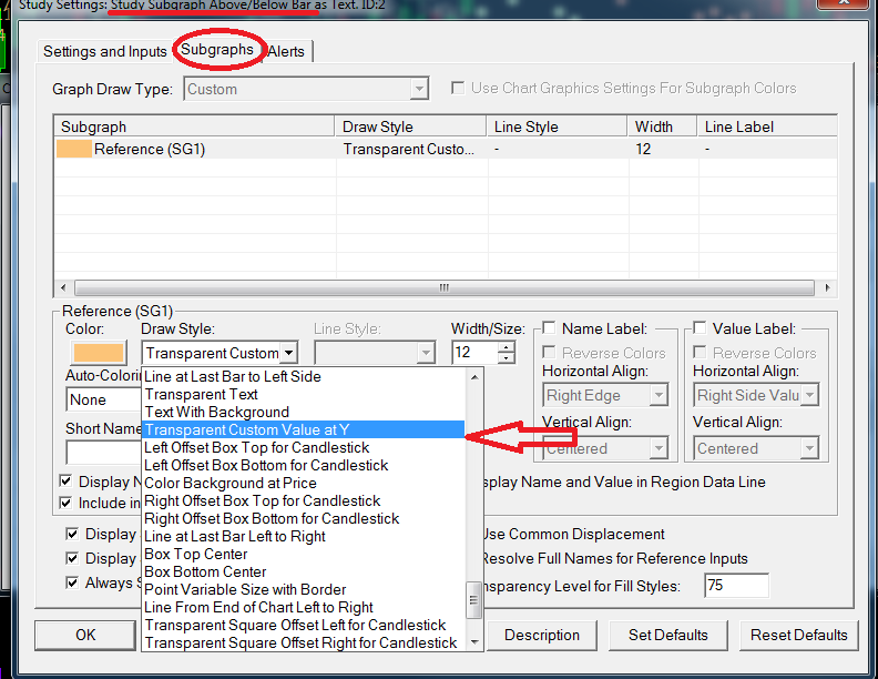 Here is the relevant Draw Style: Chart Studies: Transparent Custom Value At Y (ACSIL: DRAWSTYLE_TRANSPARENT_CUSTOM_VALUE_AT_Y) Sierra Chart Support - Engineering Level Your definitive source for support. Other responses are from users. Try to keep your questions brief and to the point. Be aware of support policy: https://www.sierrachart.com/index.php?l=PostingInformation.php#GeneralInformation For the most reliable, advanced, and zero cost futures order routing, *change* to the Teton service: Sierra Chart Teton Futures Order Routing |