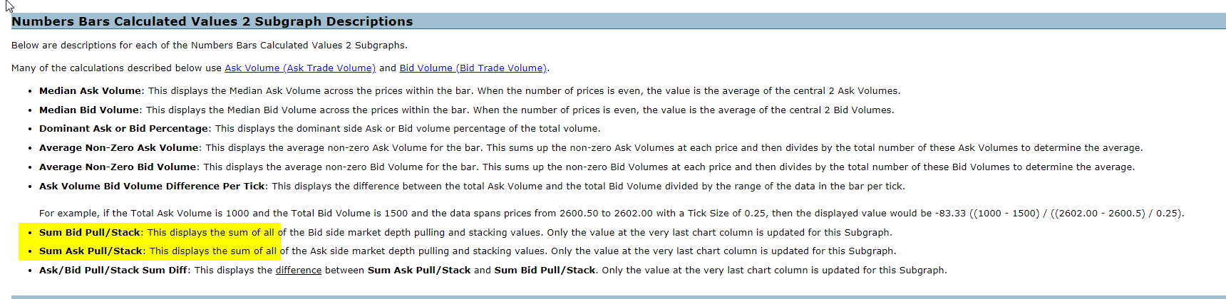 Global Trade Settings Windows: Maximum Bid/Ask Market Depth Pulling/Stacking Levels (Global Settings >> Chart DOM Settings) does the global settings apply to the Numbers Bars Calculated values 2, or just the dom? Sum Bid Pull/Stack: This displays the sum of all of the Bid side market depth pulling and stacking values. Only the value at the very last chart column is updated for this Subgraph. At least one of the Pulling/Stacking columns needs to be displayed in the DOM in order to see this subgraph information.