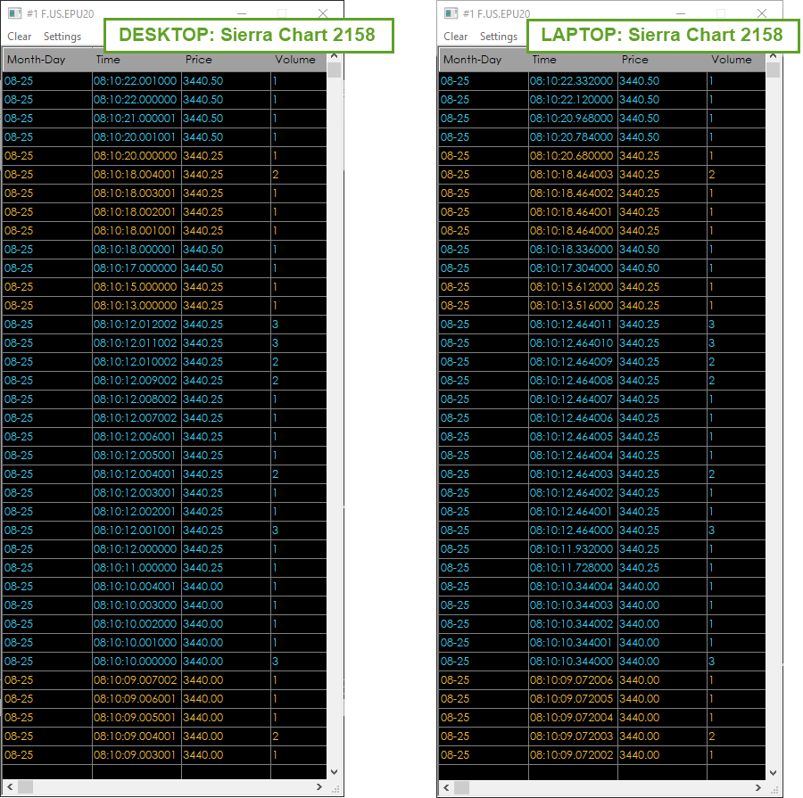 Hello, I have a problem with the replay. I have a laptop and a desktop, both have been updated to version 2158 of Sierra Chart. On the PC, during replay, the update is always done second by second. On the laptop there is no such problem, everything works. I took a screenshot of the Time and Sales Window for you. I wanted to know if there is an option box somewhere for replay in milliseconds. Best Regards. Dorian |