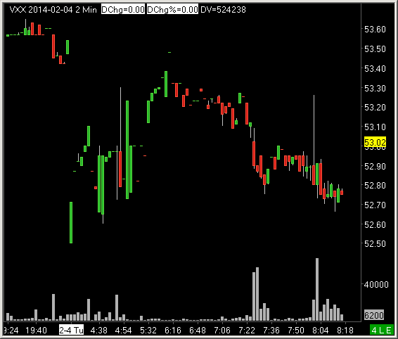 This is being posted after an email conversation with IQFeed support, and I was asked by the SC team to post it here for proper tracking. In the morning before US markets open, and in the evening after markets have closed, the last price showing on my charts and quote board jumps between two different prices: the actual last trade which has taken place in the premarket or after hours, and the last trade of the prior trading day. So whether at 4:05pm ET, 9:25am ET, or anywhere in between, the quote board will briefly report an actual trade if it takes place (for a few seconds); then, it will go back to showing the last price as the last trade of the prior close, and this causes the stock to show up as unchanged. So even if GOOG is up $50 a half hour before the open, after a few seconds of inactivity, the quote board reverts to a 0% change and the stock looks flat. Likewise, on a chart an actual print will occur, but then the last price box will go back to the prior closing price after a few seconds. After talking to IQFeed, it seems that a possible reason for this is that the "Last" field is in fact the Last trade of the regular stock session. For after hours, "ET Last" is the field which shows the actual last traded price in the extended trading session. As I use the Watch Quote app to monitor these fields, I do not see Last changing in the premarket, even though ET Last is updating to reflect current trades. So I am not sure what Sierra is using as the Last price for a quote board or chart, but either way, it seems that in either case we would want the last price to show the actual last transaction that has taken place, and would never want to show this as the prior day's closing price. As it stands, a glance at my quote board premarket makes it impossible, looking at a screen of 150 stocks, to determine how many are red and how many are green, since over half of them are at any given time being reported as unchanged, even though they are actually trading well away from unchanged. I do not know whether ET Last will update during regular market hours to match Last, but there are a couple of possibilities: 1) On a chart, when Extended session is turned on, use ET Last instead of Last; for a quote board, include an ET Last field 2) If ET Last does indeed match Last during regular hours (which IQFeed has confirmed, but I have not myself confirmed), then just use ET Last instead of Last all the time. Why would we care about Last, if it does not indicate the Last traded price? It seems to me that IQFeed has incorrectly (if we can use that word) labeled its fields. I'm sure they have a good reason for doing things the way they have, but using Last is a bit misleading. Nonetheless, I think that if Sierra can use the field that will yield the desired behavior, then it can all work well. Thank you for your time, and for looking at this. If you would like any screen shots, video, or anything else, please let me know and I can provide whatever examples or info you need. I have attached an image of VXX from this morning. You can see the last price is quoting yesterday's close of 53.02, whereas the actual last trade was somewhere in the 52.70s. Likewise, the quote board will quote 53.02 and show unchanged, and then when a trade occurs will report VXX as lower, and then will switch back in a few moments to unchanged. Date Time Of Last Edit: 2014-02-04 13:48:03