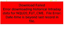 Hello, this is a new kind of message I am seeing with Version 2158. "Download Failed. Error downloading historical Intraday data for NQU20_FUT_CME. File Error: Data-time is beyond last record in file." I understand that currently the market is closed, but never seen this message before. Is this something new added? FYI, this only happens with my LIVE account using SC Order Routing + Denali Data. This error doesn't show up when using SC Data - All Services to get offline data. Date Time Of Last Edit: 2020-08-31 21:43:44