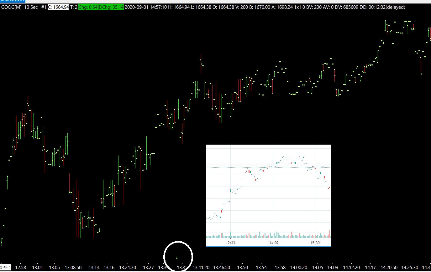 Still seeing spikes in GOOG... I have attached two screenshots, one with odd lot equities trades enabled, the other without. You can see a thicker green line with odd lot equity trades. Both have spikes. Also, checking the box odd lot equity trades changes the chart immediately. A re-download after changing that setting doesn't change the chart. |