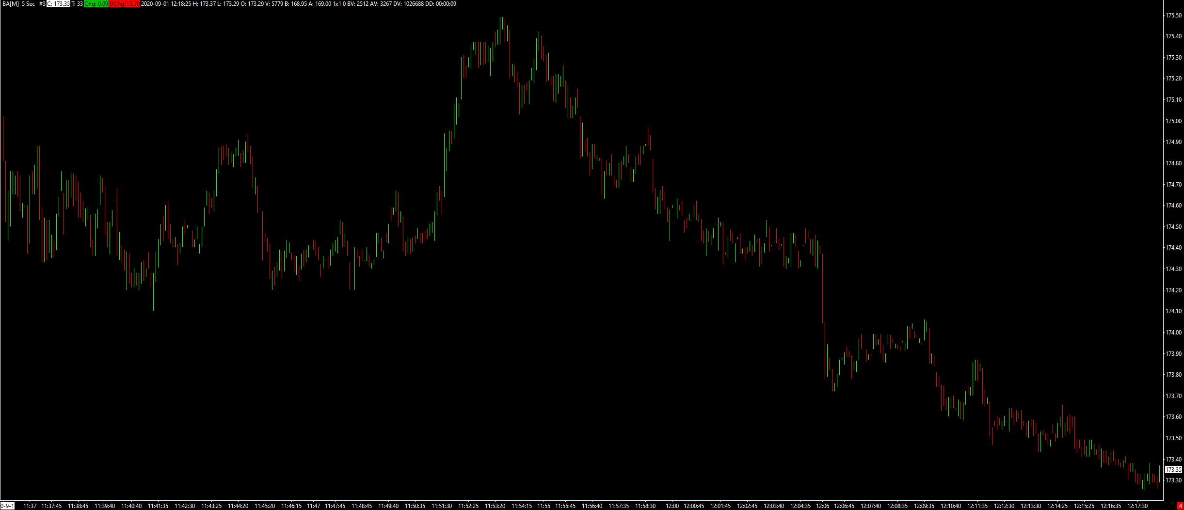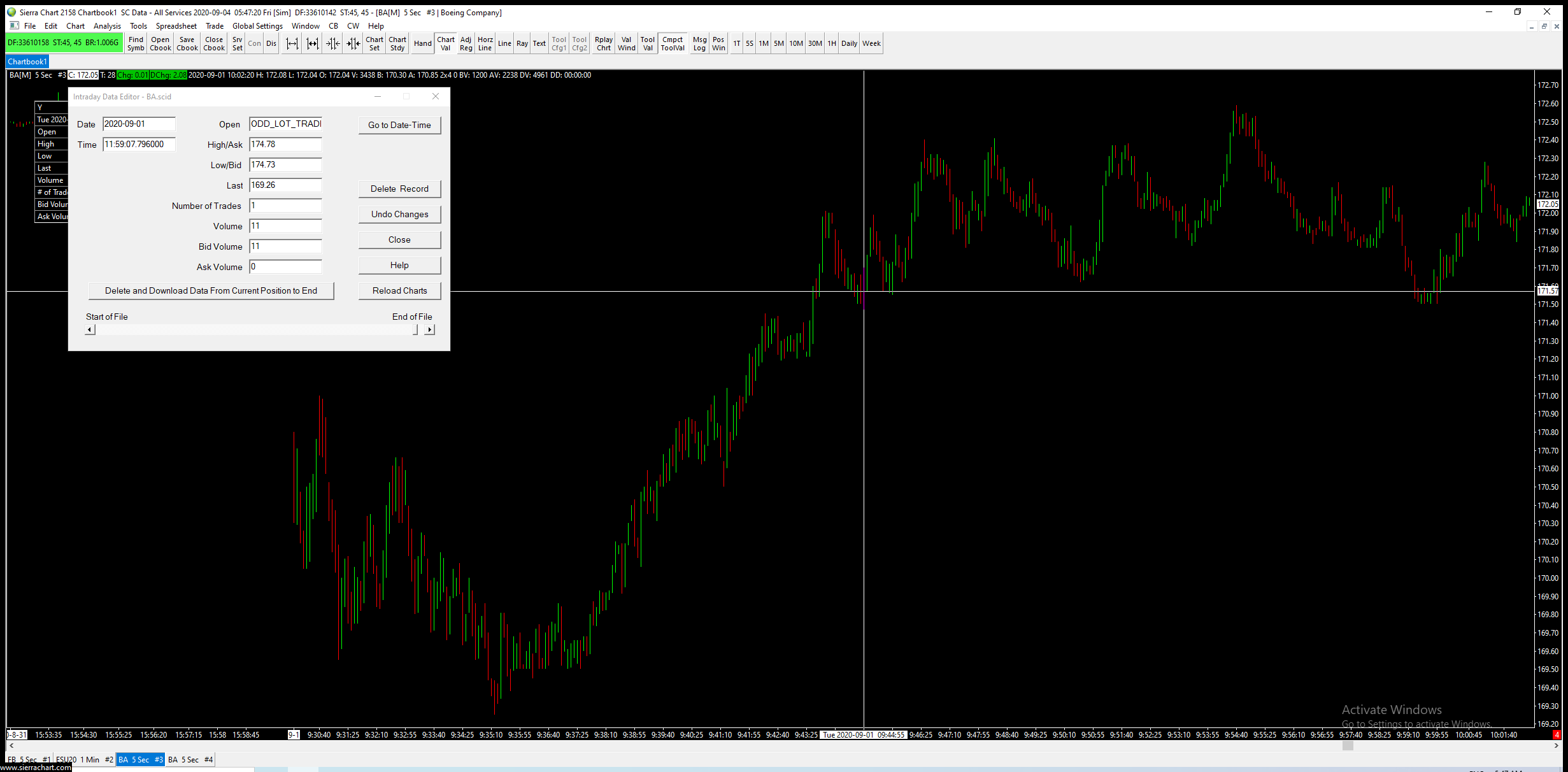 I received the following 5 second bar data for BA on 9/1 at 11:59:05 from the DTC server: {"Type":803,"F":[1,1598975945,174.57009887695312,174.65370178222656,169.25999450683594,174.59999084472656,4370,42,4370,0,0]} However, this does not show up in the chart: http://www.sierrachart.com/image.php?Image=1599165395999.png Why does it not show up in the chart but is returned by the DTC server? You can see the low value of 169.26 is really out of wack and was actually the low of day value that occured at around 9:35 AM. Why is the DTC server sending bad data?  |