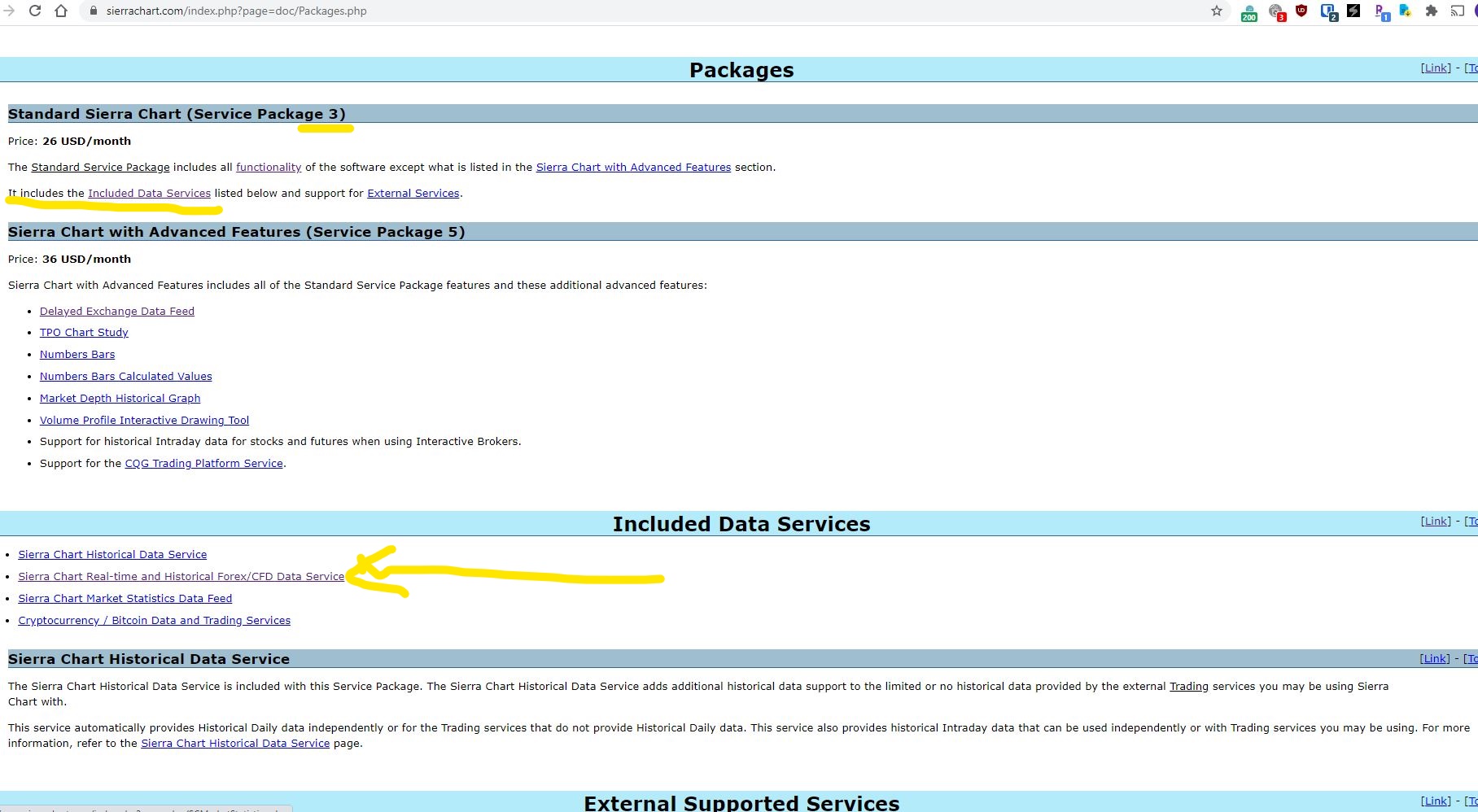 But look at your own web Description of Service Packages and Pricing: Packages which said Service Package 3 does include: Sierra Chart Real-time and Historical Forex/CFD Data Service , just please see I did screenshot too and attached. You cannot read that and not see it is 100% clear. Also the deal advertised by AMP and by also you clearly states Service #3 is not diminished version because of AMP billing -- sorry but I see this answer that I must have Advanced Package 5 completely wrong by your own web and AMP! More place this is clearly stated: Supported Data and Trading Services: Supported Services |