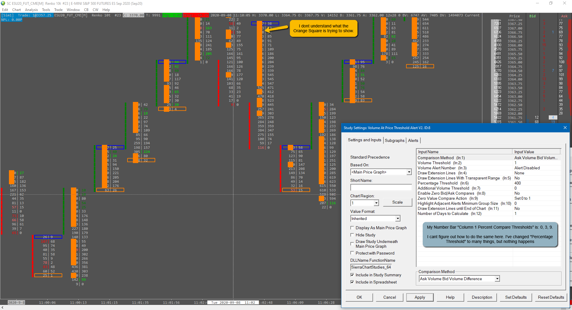 The orange squares represent a price value that meets the criteria that you have setup in your Volume at Price Threshold Alert V2 inputs. In the case of the image you have supplied, it is displaying an orange square at each price level in which the Ask Volume minus the Bid Volume has a value of 1 or larger (Comparison Method = Ask Volume Bid Volume Difference, Volume Threshold = 1). If you only want to alert when the imbalance ratio is 300%, then you would set the Comparison Method to Ask Volume Bid Volume Ratio and set the Percentage Threshold to 300 (you use the Percentage Threshold here since it is a ratio). All of this is explained in the documentation for the study here: Volume at Price Threshold Alert V2 For the most reliable, advanced, and zero cost futures order routing, use the Teton service: Sierra Chart Teton Futures Order Routing |