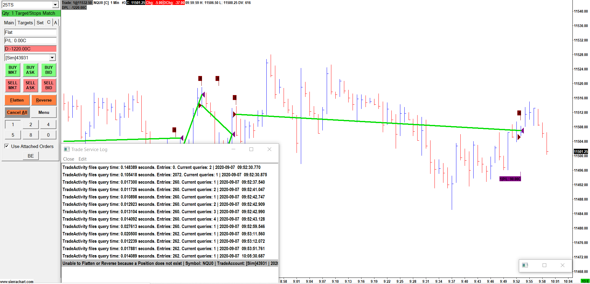 For the past few days I have been having problems with orders being opened after I flatten/cancel.  I'm on Sim mode trying to troubleshoot and don't want to risk live mode if this issue persists.  I open a position, then I'll flatten, the position is closed, but what happens is that where I flatten another position is opened.  I don't see this until I open a second position, flatten it and show order fills.  The first Flatten is showing to be the open of the second closed position.  Now the open of the second position remains opened until I open/flatten a 3rd.  As you can see from the image I've provided, the order fills are showing there is a position opened indicated by the horizontal red arrow with no green line attached.  My trade orders window shows nothing.  If I try to flatten or cancel the Trade Service Log says: "Unable to Flatten or Reverse because a Position does not exist | Symbol: NQU0 | TradeAccount: [Sim]43931 | 2020-09-07 10:14:22.515 *" Anyone know how I might fix this glitch? http://www.sierrachart.com/image.php?Image=1599499245996.png  |