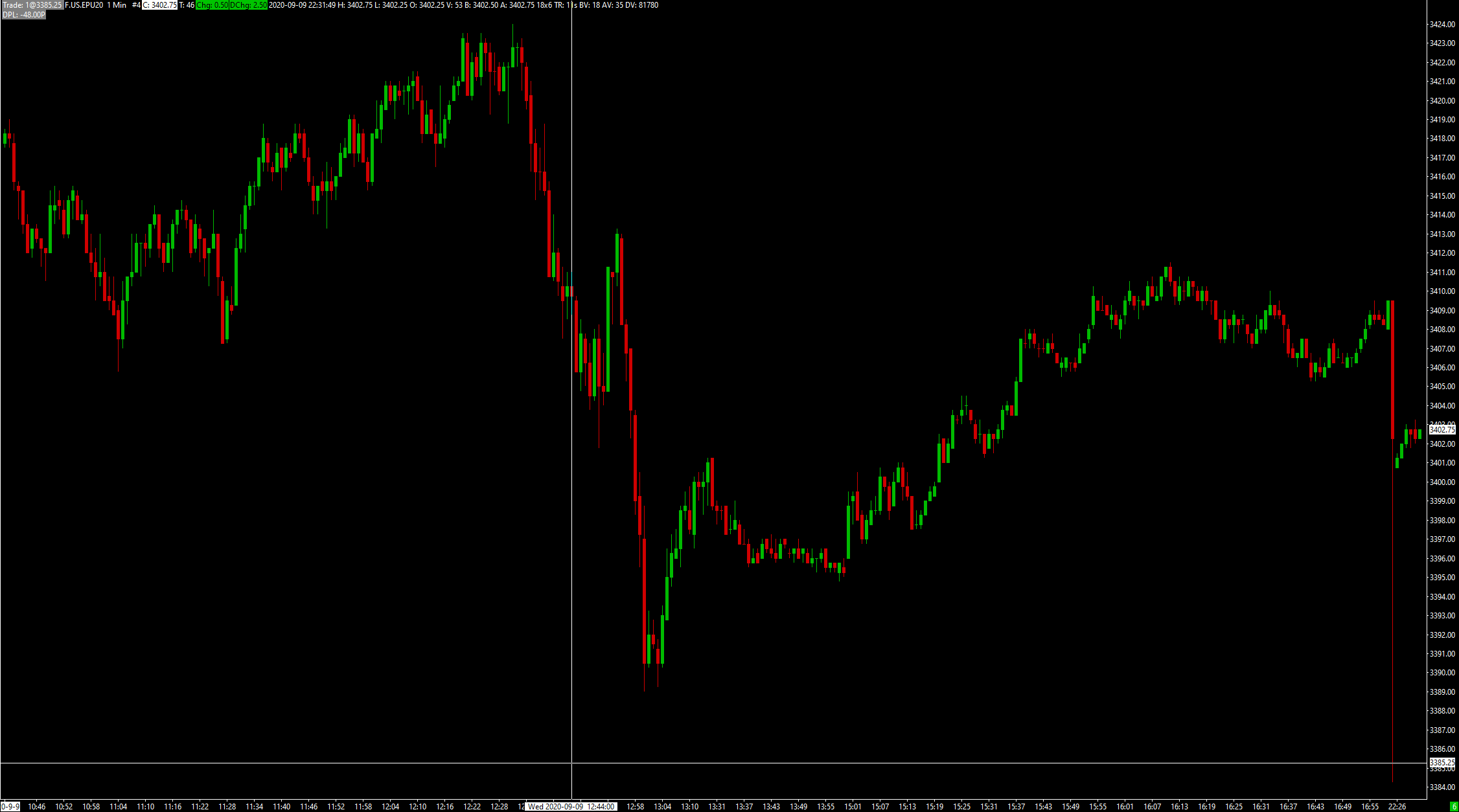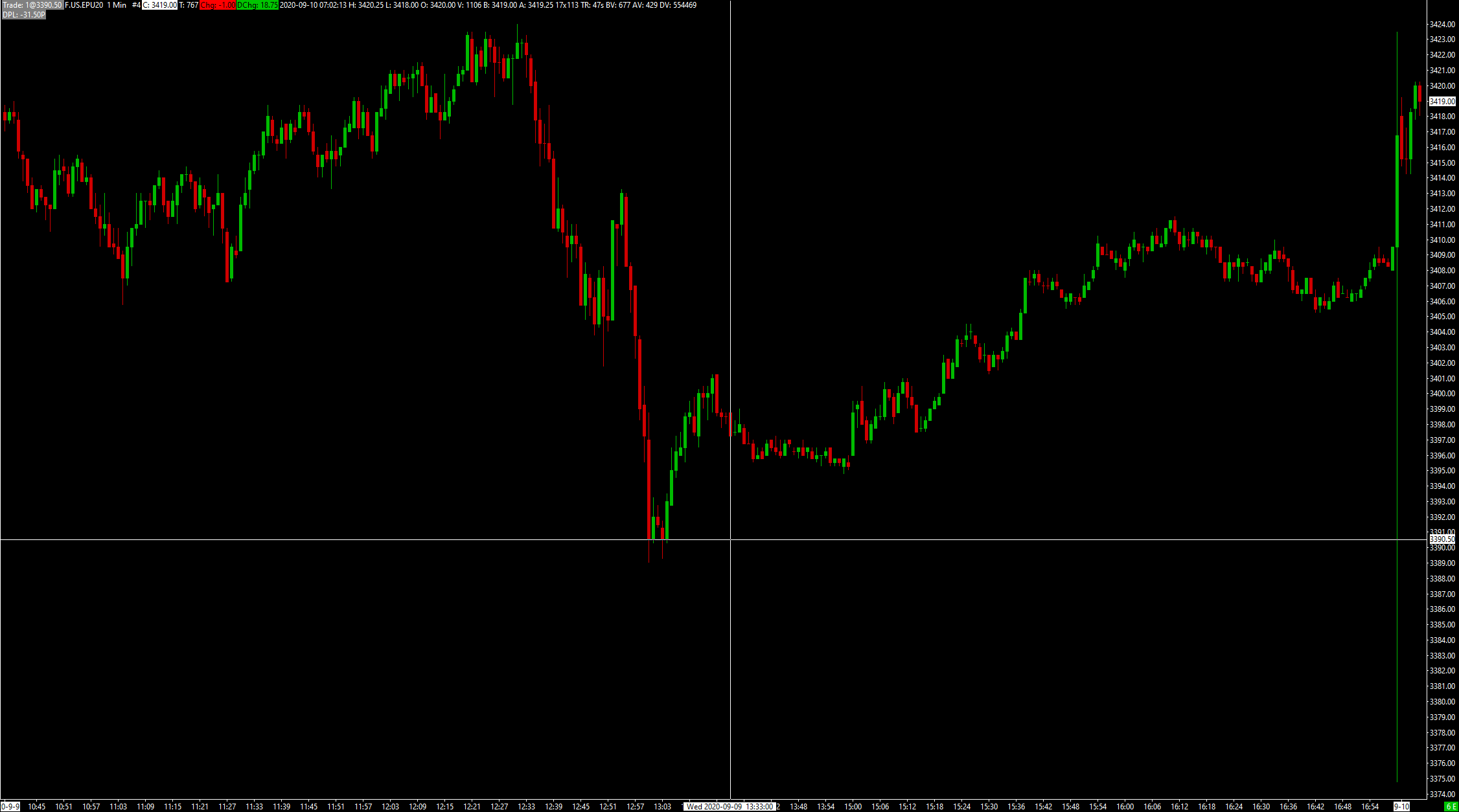 Hi, I did "Delete All Data and Download", it unfortunately did not fix the issue. Please see screenshot and message log below. In the screenshot, all trade data from last night pacific time 5pm is in one 5pm candlebar.  http://www.sierrachart.com/image.php?Image=1599746534170.png ---- Software version: 2163 64-bit | 2020-09-10 06:57:18.116 Primary Thread ID: 14864 | 2020-09-10 06:57:18.116 Usage end date: 2020-09-30 | 2020-09-10 06:57:18.116 Enabled for: Advanced Features 2. | 2020-09-10 06:57:18.116 Enabled for: Sierra Chart Historical Data Service. | 2020-09-10 06:57:18.116 Enabled for: Delayed Denali Real-Time Exchange Data Feed. | 2020-09-10 06:57:18.116 Allow Support for Sierra Chart Data Feeds is enabled. | 2020-09-10 06:57:18.116 Current selected Data/Trading service: CQG WebAPI | 2020-09-10 06:57:18.116 Custom symbol settings values: disabled | 2020-09-10 06:57:18.116 Chart Update Interval: 500 | 2020-09-10 06:57:18.116 Intraday Data Storage Time Unit: 1 | 2020-09-10 06:57:18.116 Time Zone: -07:00:00 (PST-08PDT+01,M3.2.0/02:00,M11.1.0/02:00) | 2020-09-10 06:57:18.116 2020-09-10 06:57:18 Local computer time | 2020-09-10 06:57:18.116 2020-09-10 13:57:18 Local computer time in UTC | 2020-09-10 06:57:18.116 2020-09-10 06:57:18 Local computer time in SC Time Zone | 2020-09-10 06:57:18.116 2020-09-10 13:41:31 Server time in UTC | 2020-09-10 06:57:18.116 Local computer UTC time and Server UTC time difference: 1 seconds. | 2020-09-10 06:57:18.116 Program path: C:\SierraChart\ | 2020-09-10 06:57:18.116 Data Files path: C:\SierraChart\Data\ | 2020-09-10 06:57:18.116 OS Version Number: 10.0 | 2020-09-10 06:57:18.116 Locale Setting: C | 2020-09-10 06:57:18.116 DLLs: UserContributedStudies.dll, UserContributedStudies_64.dll | 2020-09-10 06:57:18.116 Allowed protected custom studies: | 2020-09-10 06:57:18.116 Added historical Intraday data request for F.US.EPU20 to the queue. | 2020-09-10 06:57:28.529 Intraday data recording state for symbol F.US.EPU20 is set to download 'Pending'. | 2020-09-10 06:57:28.529 Triggering next historical data download in queue. | 2020-09-10 06:57:28.529 HD Request # 28 | Downloading Intraday chart data for F.US.EPU20 to the file F.US.EPU20.scid. Service: cqg | 2020-09-10 06:57:28.529 Reloading all charts with filename: F.US.EPU20.scid | 2020-09-10 06:57:28.605 HD Request # 28 | Download start date-time: 2020-03-08 06:57:28.000 | 2020-09-10 06:57:28.606 HD Request # 28 | Using server: ds3.sierracharts.com port 10149 | 2020-09-10 06:57:28.606 Socket (1) | Creating socket. | 2020-09-10 06:57:28.606 Socket (1) | Connecting to IP: 65.182.172.42. | 2020-09-10 06:57:28.606 F.US.EPU20 #2 | Reloading chart. | 2020-09-10 06:57:28.636 F.US.EPU20 #2 | StartDateTimeForLoadingOrderFills: 00:00:00 | 2020-09-10 06:57:28.636 F.US.EPU20 1 Min #1 | Reloading chart. | 2020-09-10 06:57:28.645 F.US.EPU20 1 Min #1 | Currently no data in file to display. Will start historical data download and real-time updates. File: C:\SierraChart\Data\F.US.EPU20.scid | 2020-09-10 06:57:28.652 HD Request # 28 | Setting DTC encoding to Binary VLS | 2020-09-10 06:57:28.766 HD Request # 28 | Sending historical data logon request message. | 2020-09-10 06:57:28.766 HD Request # 28 | Requesting Intraday data. Start date-time: 2020-03-08 06:57:28. Record interval: 1. Symbol: F.US.EPU20 | 2020-09-10 06:57:28.834 HD Request # 28 | Decompressing data. | 2020-09-10 06:57:28.902 HD Request # 28 | Receiving Intraday data for F.US.EPU20 starting at 2020-03-08 15:00:00 | 2020-09-10 06:57:29.022 HD Request # 28 | Timestamp of first Intraday data file record written: 2020-03-08 15:00:00 | 2020-09-10 06:57:29.745 F.US.EPU20 1 Min #1 | StartDateTimeForLoadingOrderFills: 2020-03-08 15:00:00 | 2020-09-10 06:57:30.213 Saved Chartbook: candle1.Cht. Time: 0.0015 seconds. | 2020-09-10 06:58:09.132 Saved Chartbook: ChartbookExample.cht. Time: 0.0025 seconds. | 2020-09-10 06:58:09.136 Socket (1) | CloseSocket call. | 2020-09-10 06:58:12.111 Socket (1) | 0 bytes remaining in receive buffer when socket closed. | 2020-09-10 06:58:12.111 Historical data download thread signaled to stop. | 2020-09-10 06:58:12.111 Socket (1) | Shutdown started. Waiting for graceful close. | 2020-09-10 06:58:12.112 HD Request # 28 | Received 4403097 records from 2020-03-08 15:00:00.000 to 2020-09-09 17:00:00.000 (185.1 days) and wrote 3031661 records for F.US.EPU20 | 2020-09-10 06:58:12.113 Added 11 Time and Sales records to Intraday data file for F.US.EPU20 after download. | 2020-09-10 06:58:12.123 HD Request # 28 | Completion time: 44s | 2020-09-10 06:58:12.132 HD Request # 28 | Intraday data download complete for F.US.EPU20. Unique request ID: 27 | 2020-09-10 06:58:12.132 Removing historical data download ID 27. | 2020-09-10 06:58:12.132 Real-time Intraday chart data file updates started for F.US.EPU20 | 2020-09-10 06:58:12.132 Opened cached Intraday file: C:\SierraChart\Data\F.US.EPU20.scid. Thread ID: 14864 | 2020-09-10 06:58:12.132 Intraday chart data file opened for F.US.EPU20 | 2020-09-10 06:58:12.132 HD Request # 28 | Enabling Intraday chart updating for symbol. | 2020-09-10 06:58:12.132 Triggering next historical data download in queue. | 2020-09-10 06:58:12.133 Socket (1) | Socket gracefully closed by remote side. | 2020-09-10 06:58:12.181 Socket (1) | Closed. | 2020-09-10 06:58:12.181  |