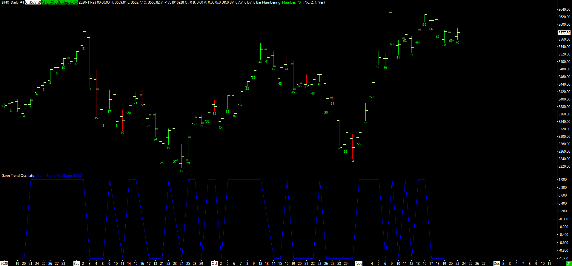 Here is the Gann Trend Oscillator (GTO) as I understand it. * I defined an Uptrend as 2 or more bars in which the High and Low are both increasing, in which case GTO = 1. * I defined a Downtrend as 2 or more bars in which the High and Low are both decreasing, in which case GTO = -1. * In any other case, GTO = 0. I have attached both the code and a screenshot of the results. Please let me know if this study is what you expected. I am still ironing out some bugs in the Gann Swing Oscillator. |
