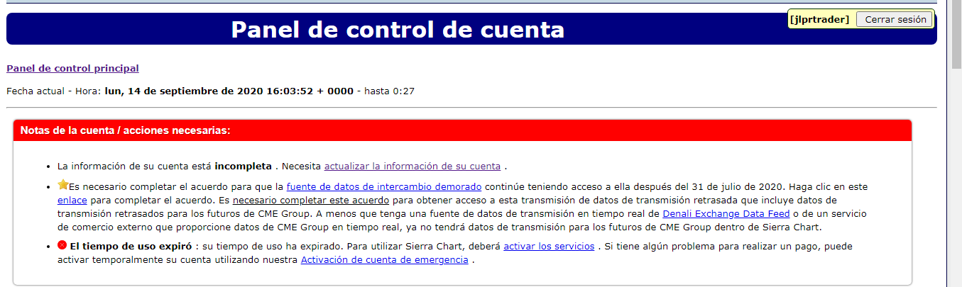 I am a user of the AMP broker, package 3 was selected, I have the access credentials but when I enter the platform, the following message appears, I attach the image and when I enter my space on the sierra chart page it throws me the following warning |