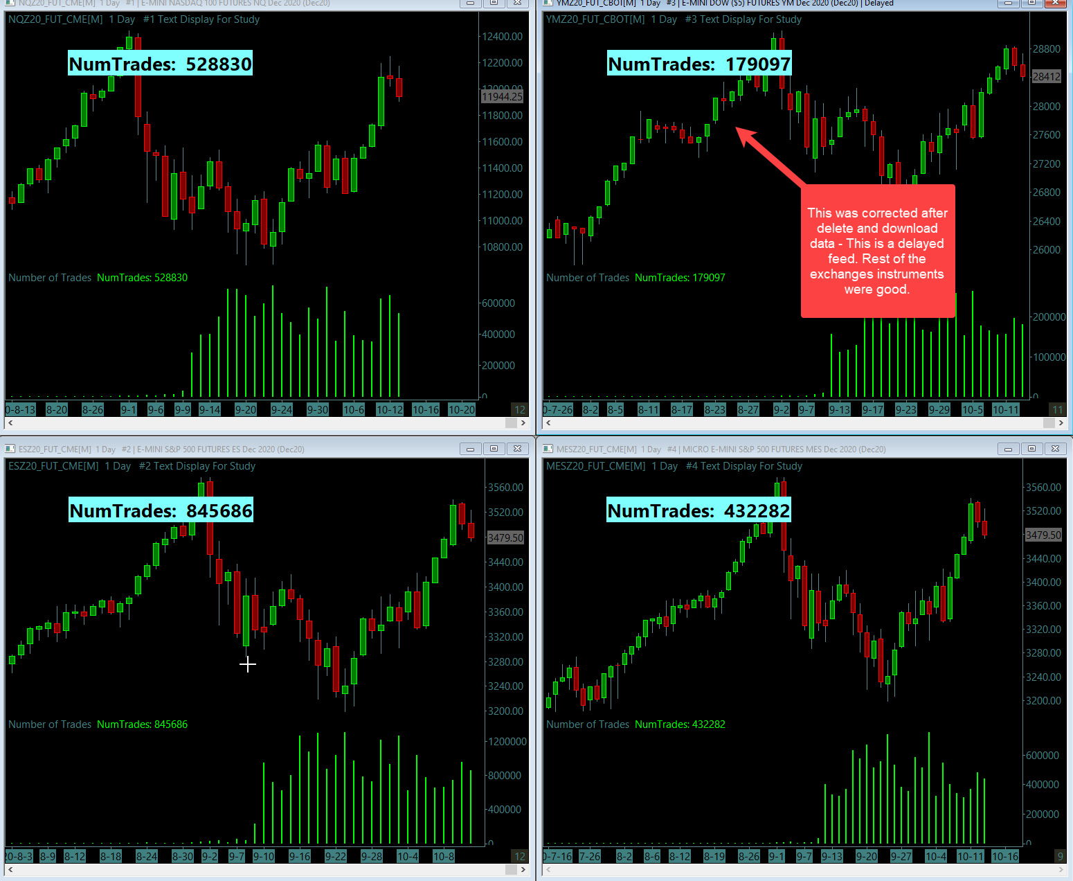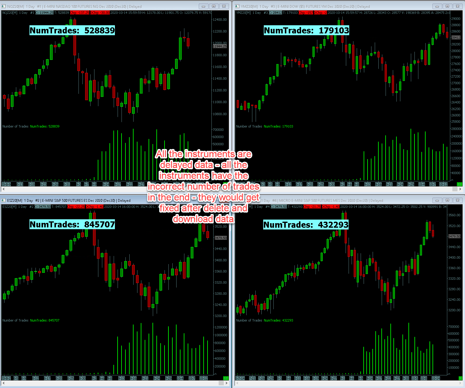 Team - Related to post #22 - if there are any auto triggered or manual historical downloads everything is working fine between instances/subinstances where real-time exchanges are enabled. But there is still a problem where delayed data is enabled. In the end - when the market is closed - the total number of trades per session doesn't match up unless delete and download data is used. There are additional records being added. As long there are no auto triggered download events - it matches up fine. Attached image 1 - This is from the instance - where there are few live exchanges and 1 delayed exchange - All the live exchange data - after the session close the number of trades matches up well. For the instrument(YM) with delayed data - there were discrepancies and were corrected after delete and download data for this specific instrument. Attached image 2 - This is the instance with delayed data for all the instruments. As you can see at the end of the session - all of them are incorrect (you can take image 1 as reference). Only way to correct them is to delete and download data. All of the historical download events triggered were automatic. Thanks Date Time Of Last Edit: 2020-10-23 16:32:06