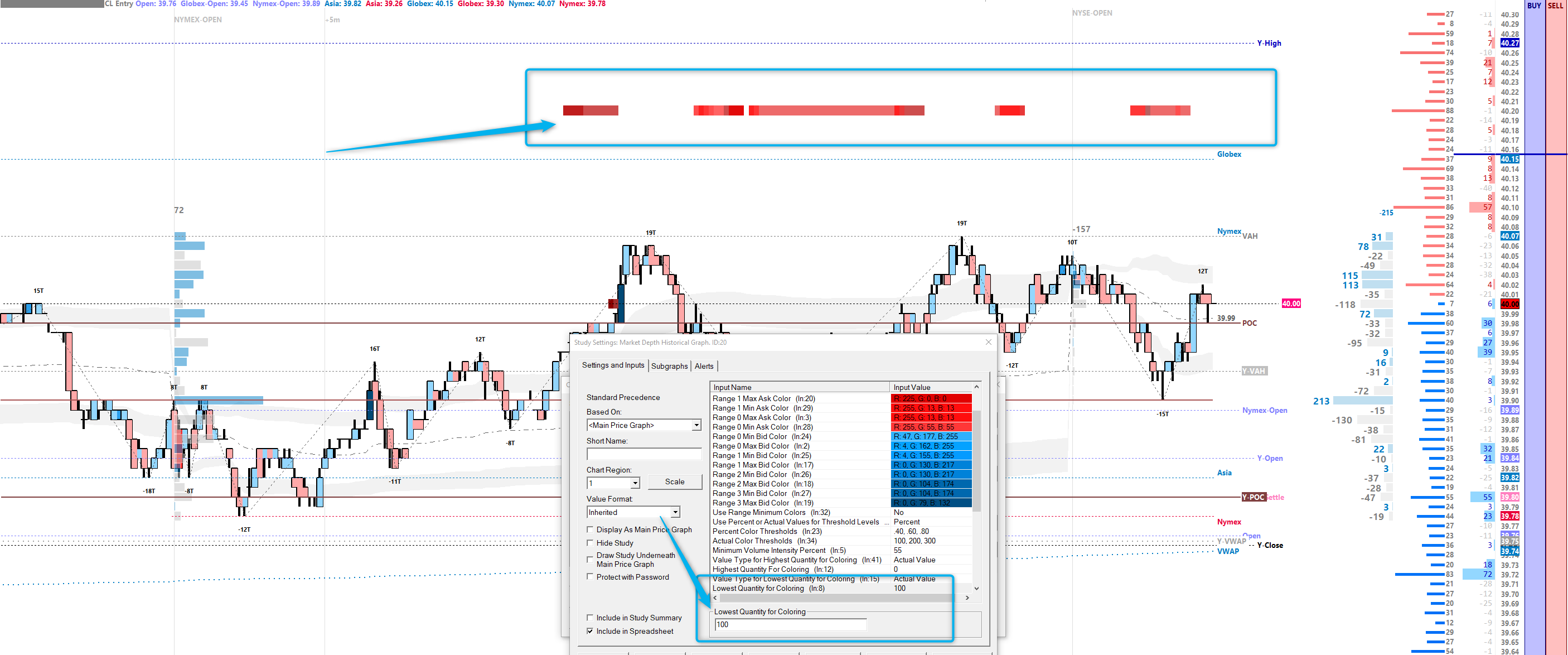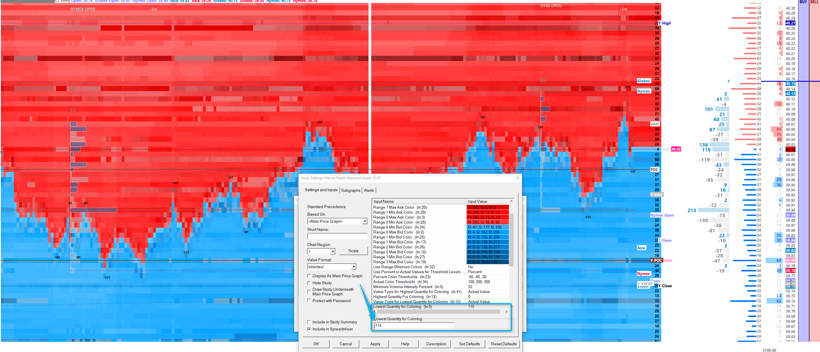 I am using 2x Market Depth Historical Graph Study on the same chart. In another study where the "Highest Quantity for Coloring" is set and scroll, the value changes automatically from the "Lowest Quantity for Coloring".